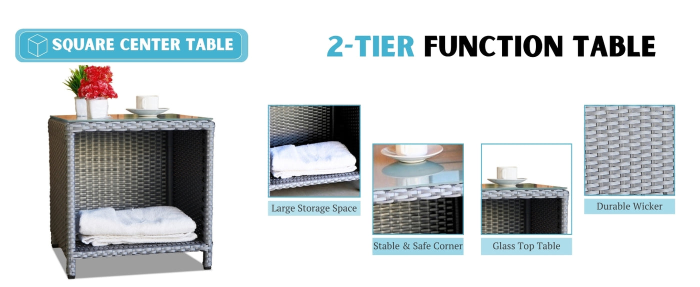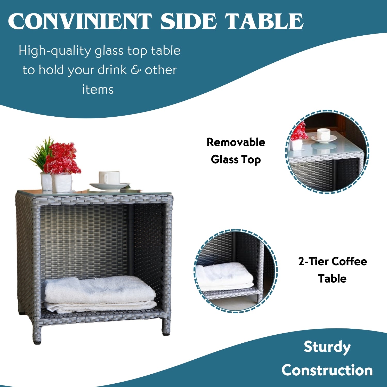 - Glass Coffee Table : Stylish and functional center table with a scratch-resistant, easy-to-clean glass top great for serving drinks, snacks, or décor in any outdoor setting.