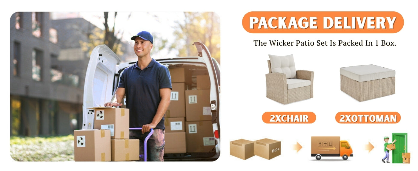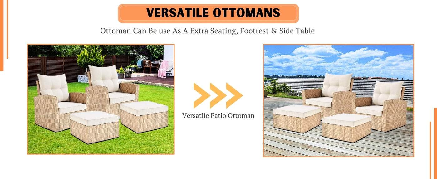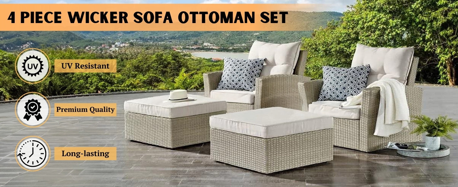 Turn your outdoor space into a cozy retreat with this elegant 4-Piece Patio Furniture Conversation Set. Designed to combine comfort, style, and durability, this bistro-style set is perfect for everything from casual lounging to evening get-togethers. Crafted with premium handwoven all-weather wicker in a rich beige finish, it seamlessly complements outdoor décors while withstanding sun, rain, and daily wear. The set includes two cushioned armchairs & two versatile ottomans. The cream-colored cushions add a refreshing contrast and are filled with thick, high-density foam to provide cloud-like relaxation. The removable cushion covers are easy to clean, making maintenance a breeze. Whether you're sipping morning coffee on your porch or entertaining guests by the pool, the ergonomic design of the chairs and the added footrests ensure a perfect balance of luxury and function. The lightweight yet sturdy powder-coated metal frame ensures long-lasting performance without compromising portability. Make your outdoors an extension of your home this 4-piece conversation set offers the ideal blend of charm, convenience, and comfort for any season.