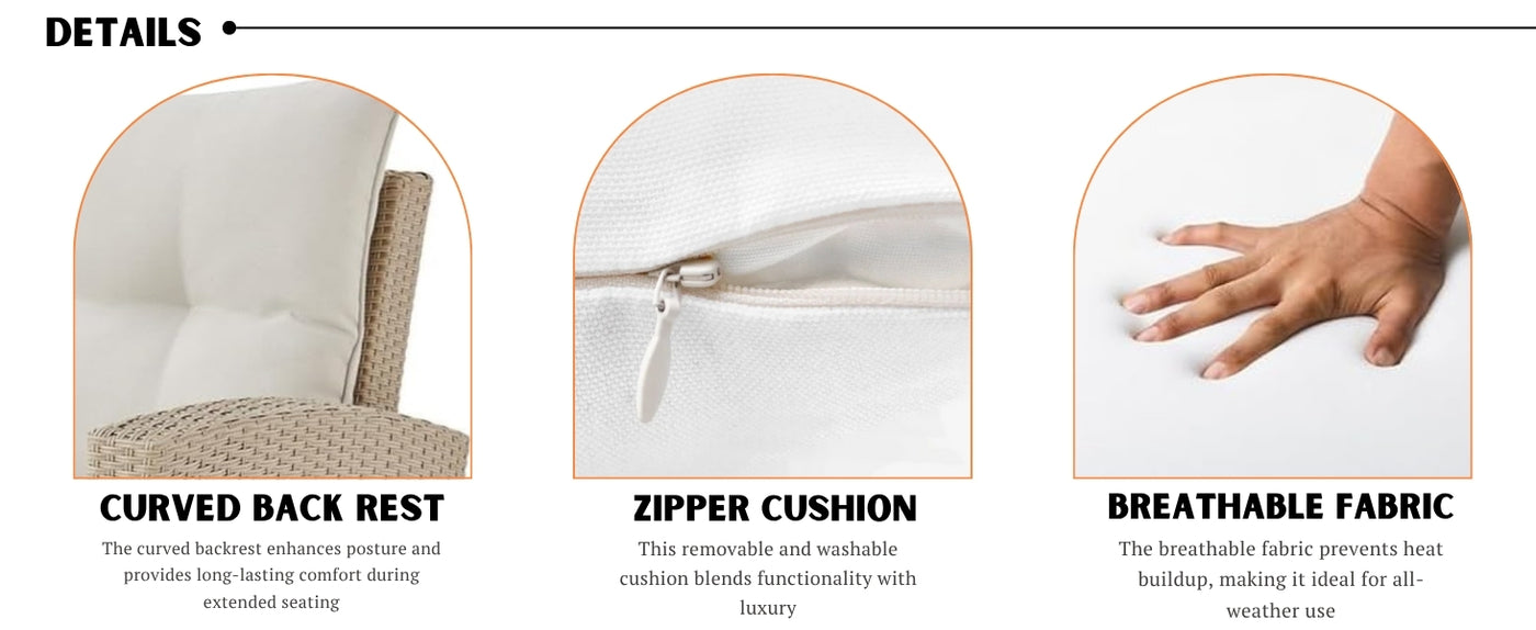 - Plush Cream Cushions with Zippers : 3” thick seat cushions provide soft, supportive comfort during long sitting sessions. Water-resistant, removable covers are easy to clean and maintain for outdoor durability.