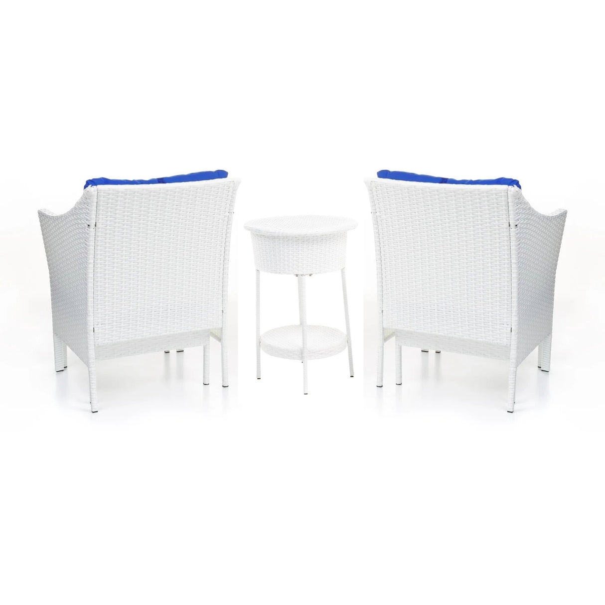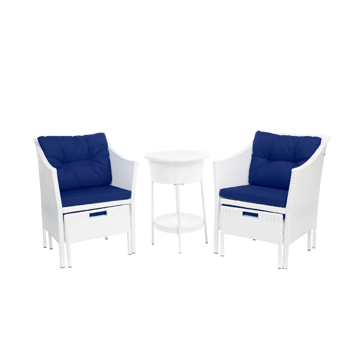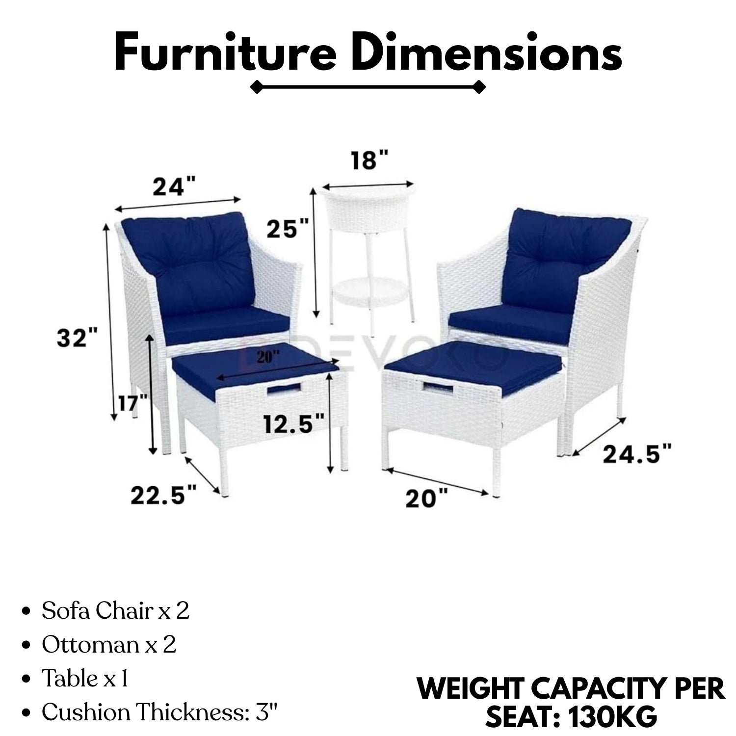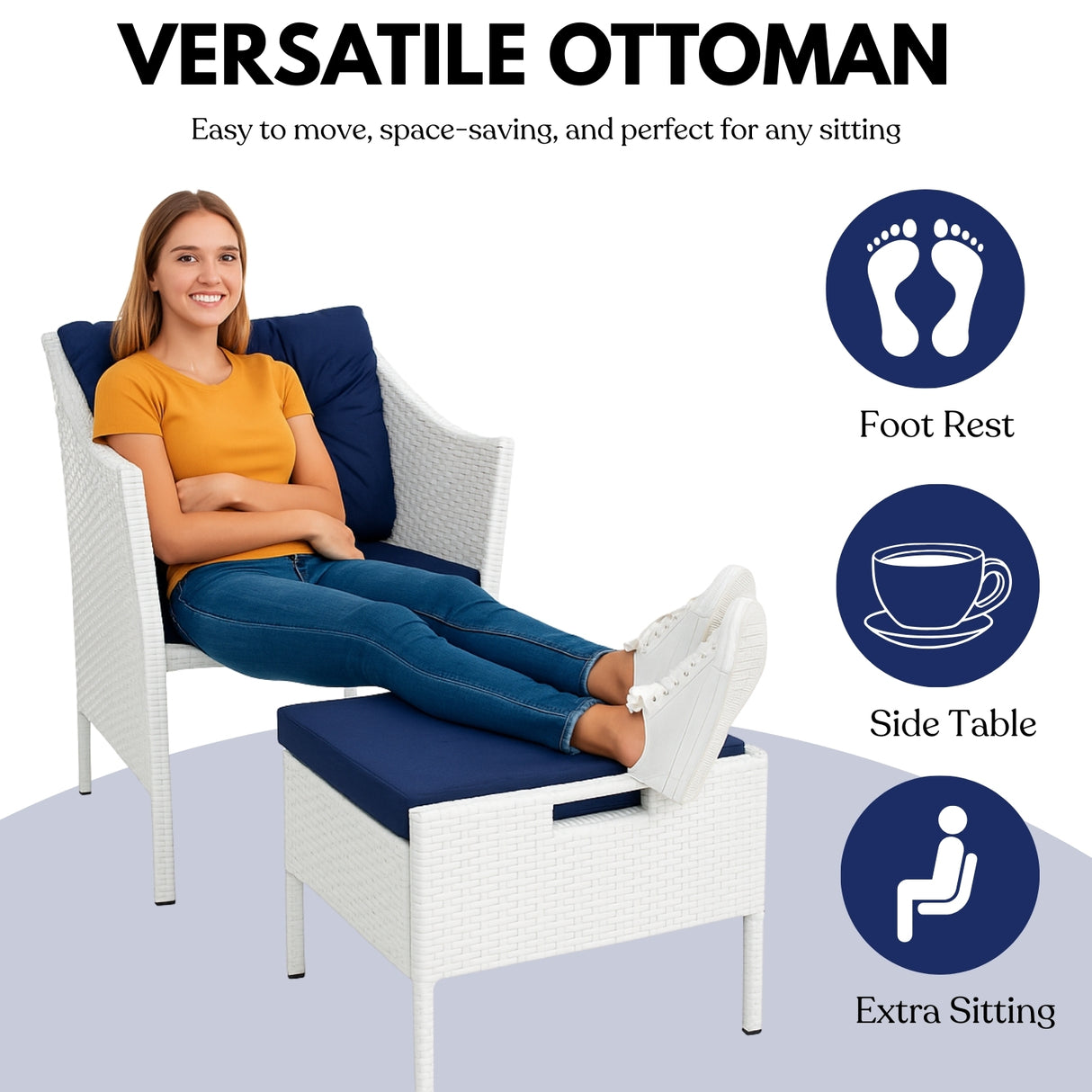 Turn your outdoor space into a cozy retreat with this elegant 5-Piece Patio Furniture Conversation Set. Designed to combine comfort, style, and durability, this bistro-style set is perfect for everything from casual lounging to evening get-togethers. Crafted with premium handwoven all-weather wicker in a rich white finish, it seamlessly complements outdoor décors while withstanding sun, rain, and daily wear. The set includes two cushioned armchairs, two versatile ottomans, and a matching coffee table with a smooth glass top, offering both comfort and practicality. The navy-blue colored cushions add a refreshing contrast and are filled with thick, high-density foam to provide cloud-like relaxation. The removable cushion covers are easy to clean, making maintenance a breeze. Whether you're sipping morning coffee on your porch or entertaining guests by the pool, the ergonomic design of the chairs and the added footrests (which neatly tuck under the chairs when not in use) ensure a perfect balance of luxury and function. The lightweight yet sturdy powder-coated frame ensures long-lasting performance without compromising portability. Make your outdoors an extension of your home—this 5-piece conversation set offers the ideal blend of charm, convenience, and comfort for any season.