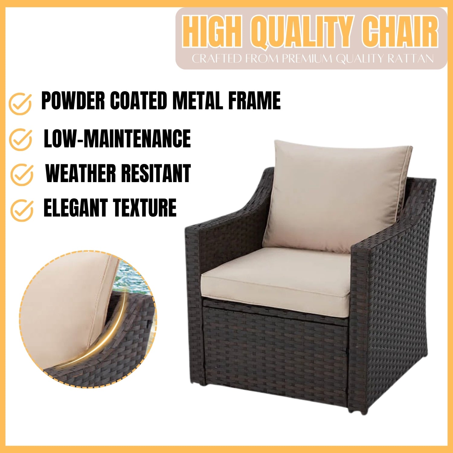 • Weather-Resistant HDPE Wicker : Crafted from high-density polyethylene rattan that’s UV-resistant and rust-proof, this set withstands rain, sun, and humidity without fading or cracking.