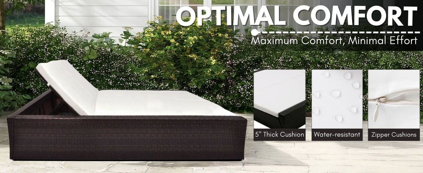 Transform your outdoor space into a luxurious relaxation zone with this Outdoor Wicker Patio Double Seater Recliner Daybed, elegantly designed in dark brown and white to complement any garden, poolside, porch, or backyard setup. Crafted for comfort, style, and durability, this daybed is the perfect blend of function and elegance turning every outdoor moment into a resort-like experience. Built with high-quality, all-weather handwoven wicker, the frame is not only visually appealing but also rust-resistant and UV-protected, ensuring year-round outdoor use. The sturdy construction rests on a powder-coated metal frame that offers excellent weight capacity and long-lasting performance. What makes this daybed stand out is its adjustable reclining backrests, allowing you and your partner or guest to individually customize seating positions from sitting upright with a drink to fully reclining for a mid-day nap. The plush waterproof cushions are soft to the touch and thick enough to provide cloud-like comfort while withstanding unpredictable weather. The white cushion covers are removable and washable, making maintenance a breeze.