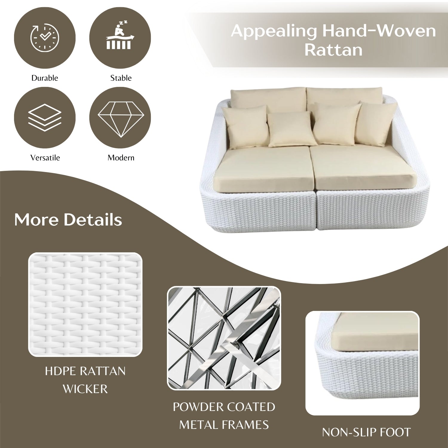 - All-Weather HDPE Rattan & Sturdy Frame : Handwoven premium wicker over a rust-resistant, powder-coated metal frame ensures year-round durability in gardens, backyards, and terraces.