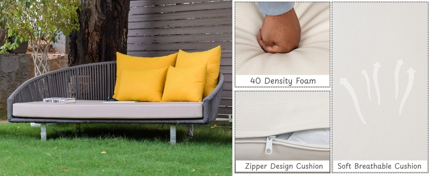 - Water-Resistant Fabric : Comes with thick, soft cushions in a neutral tone. Made from water-resistant and fade-proof fabric, these cushions offer luxurious comfort and easy outdoor maintenance.