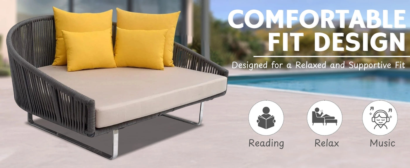 Elevate your outdoor space with this stylish and durable Outdoor Rope Patio Daybed, designed for ultimate relaxation and modern aesthetics. Crafted with a sturdy powder-coated metal frame and handwoven weather-resistant rope, this daybed offers exceptional durability to withstand all seasons. The ergonomically curved high backrest provides excellent support, while the thick, soft cushion adds cloud-like comfort for long hours of lounging. Perfect for gardens, terraces, backyards, or balconies, this outdoor daybed combines luxury and practicality in one elegant piece. Its breathable design ensures airflow, preventing heat buildup on sunny days. The removable, washable cushion covers make maintenance easy, keeping your space looking fresh and inviting. Whether you're sunbathing, reading, or hosting guests, this versatile daybed adds a touch of sophistication to any outdoor setting.