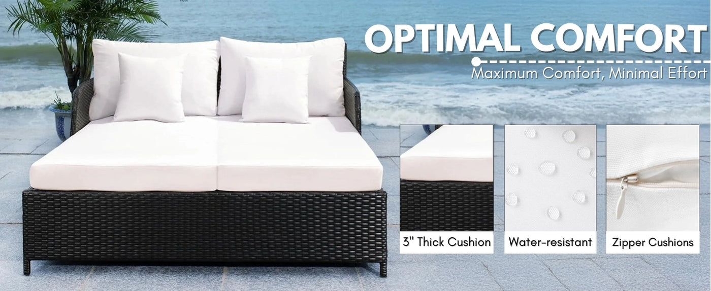 Transform your outdoor space into a luxurious escape with this Outdoor Patio Double Seater Daybed, designed to bring unmatched comfort and elegance to your terrace, garden, porch, or backyard. Crafted for those who cherish both style and serenity, this versatile furniture piece is the perfect spot to unwind, nap, read, or enjoy quality time with a loved one. Built with a sturdy, weather-resistant frame, this daybed is engineered to withstand the elements, offering long-lasting durability without compromising on looks. Its clean, contemporary design seamlessly blends into any outdoor decor from modern terraces to lush garden corners. The spacious double seating ensures plenty of room to stretch out, relax, and enjoy the outdoors in true comfort. The daybed comes equipped with thick, water-resistant padded cushions that provide cloud-like softness while standing up to rain, spills, and sun exposure. Whether it’s a sunny afternoon or a breezy evening, you can lounge in comfort without worrying about quick weather changes. The removable cushion covers make cleaning and maintenance effortless, so your outdoor space stays fresh and inviting.