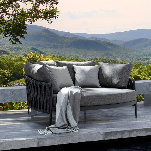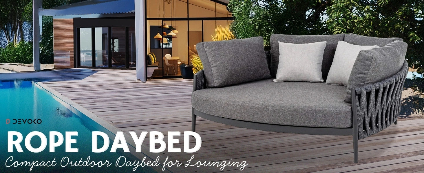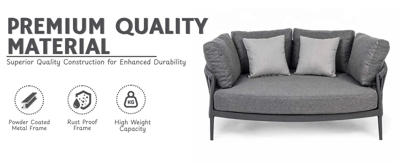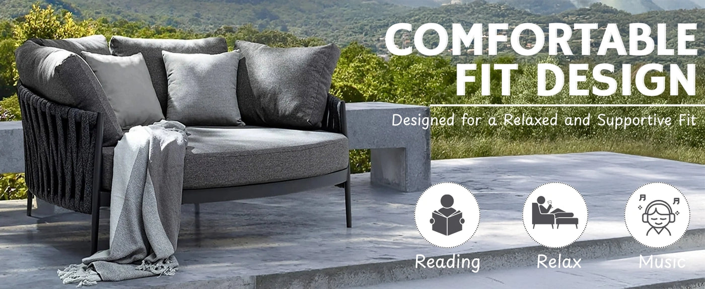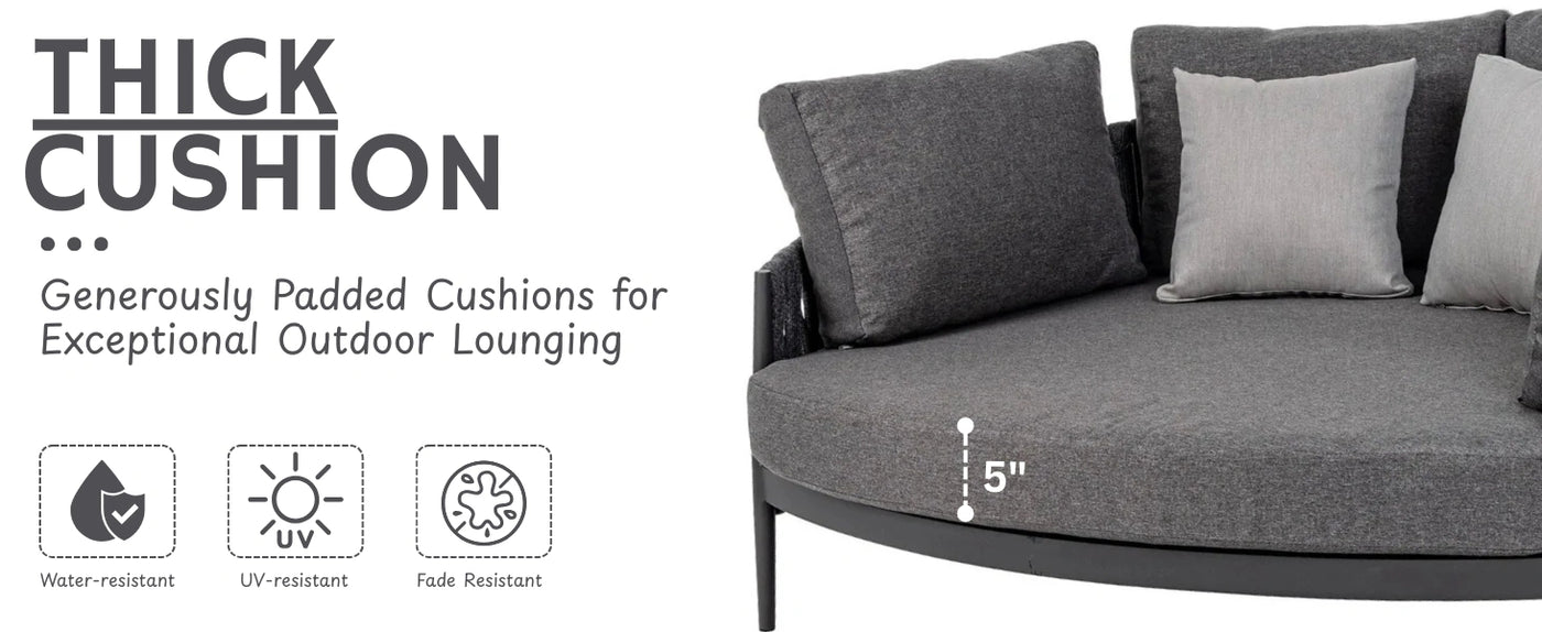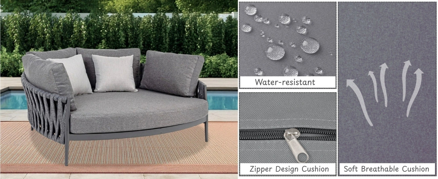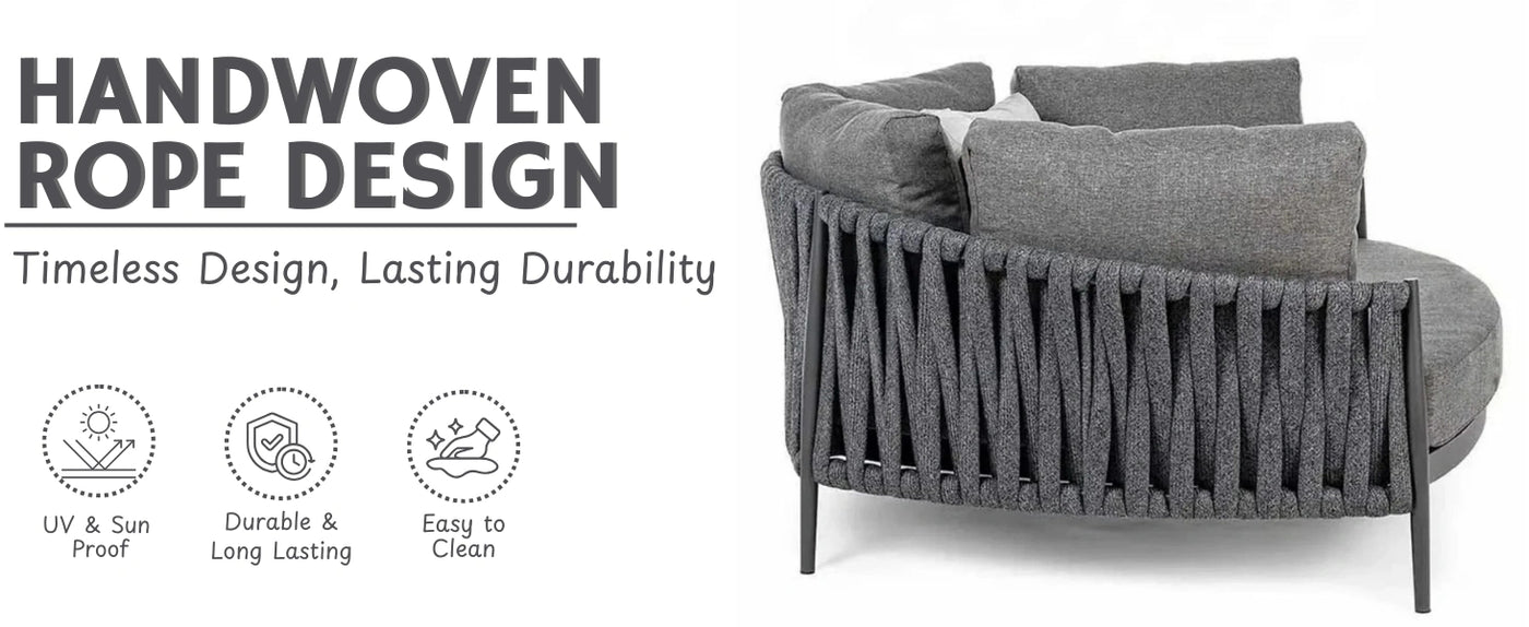 Elevate your outdoor space with this Unique Round Rope Sofa Daybed, designed for modern comfort and striking style. Perfect for poolside, garden, balcony, porch, terrace, patio, or beachside relaxation, this daybed features a contemporary circular design in elegant tones to complement any outdoor décor. Expertly crafted with a durable powder-coated frame and handwoven all-weather rope, it resists sun, rain, and moisture—ideal for year-round use. The thick, high-density cushions provide cloud-like comfort and are upholstered in water-resistant, easy-to-clean fabric for worry-free lounging. Its ergonomic high-backrest and spacious seating offer both support and room to unwind, whether you're sunbathing, reading, or enjoying evening chats outdoors. Lightweight yet sturdy, this rope daybed blends form, function, and flexibility in one stylish statement piece.
