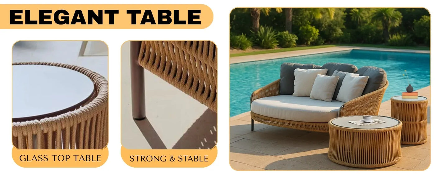 Transform your outdoor space into a serene retreat with this beautifully designed Outdoor Patio Rope Daybed, complete with a matching center and side tables. Crafted for both style and comfort, this luxurious sun lounger is ideal for lounging by the swimming pool, enjoying a garden breeze, or simply relaxing on the patio with your favorite book and a cool drink. The centerpiece of this set is the spacious rope daybed, featuring a curved, semi-enclosed structure that offers a perfect balance of privacy and openness. Wrapped in premium-quality, handwoven rope, the frame is both breathable and weather-resistant, ensuring year-round durability even under the harsh sun or occasional rain. Its sturdy powder-coated metal base provides rock-solid support while maintaining a lightweight and modern profile.