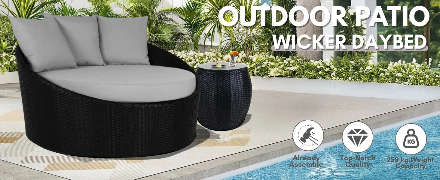 Elevate your outdoor relaxation with this stylish Rattan Wicker Daybed and matching Glass-Top Coffee Table set. Designed for both comfort and durability, this daybed features a weather-resistant handwoven rattan exterior over a strong powder-coated metal frame, ensuring long-lasting performance in all seasons. The thick, plush cushions offer cloud-like comfort and are covered in water-resistant fabric with removable, washable covers for easy maintenance. The sleek glass-top coffee table adds a touch of elegance and provides a stable surface for drinks, books, or decor. Perfect for patios, gardens, balconies, or poolside lounging, this daybed set blends modern design with practical function, making it a must-have for any outdoor space.
