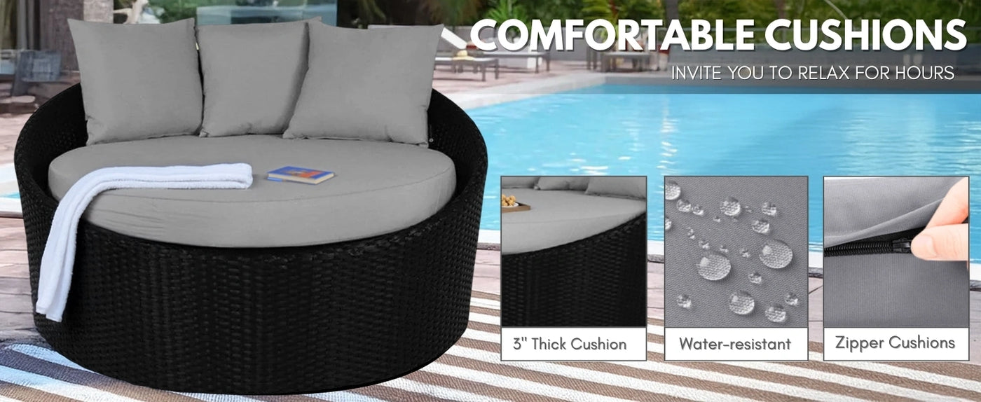 - UV-Resistant & Water-Resistant Cushions : Comes with thick, plush cushions made from UV-protected and water-resistant fabric. Ideal for lounging in comfort while preventing mold, mildew, and color fading from prolonged sun exposure.