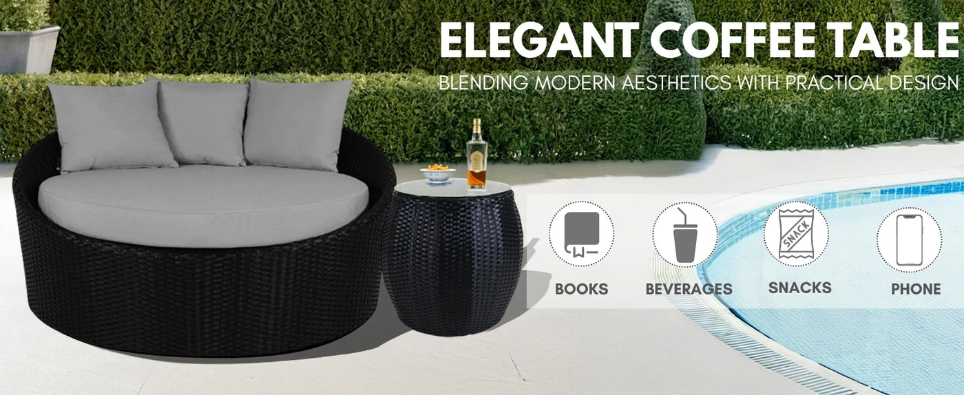 - Glass-Top Coffee Table : Features a sleek, easy-to-clean glass tabletop that is scratch-resistant and stable. Perfect for holding drinks, snacks, books, or decorative items during outdoor gatherings.