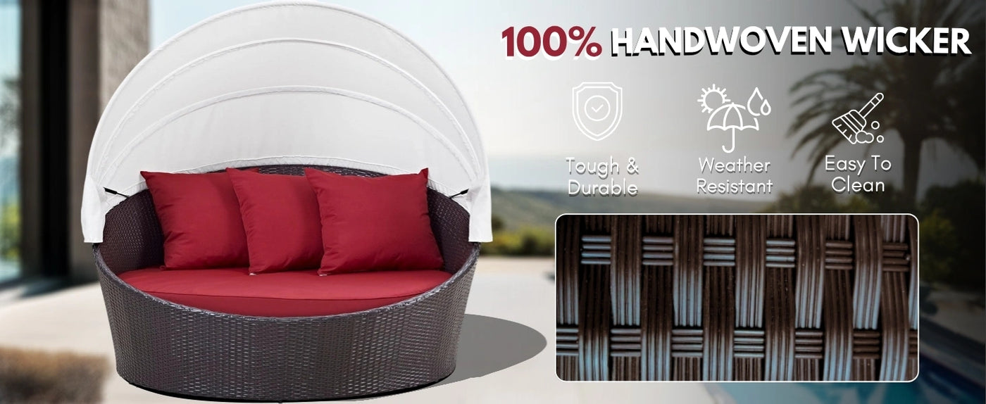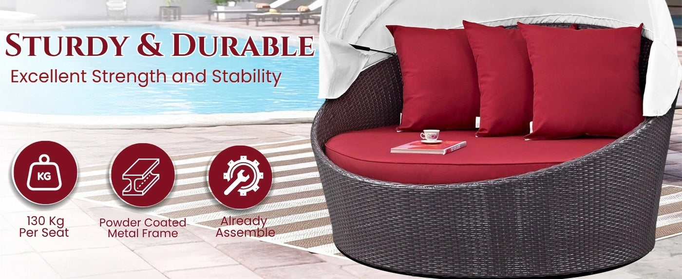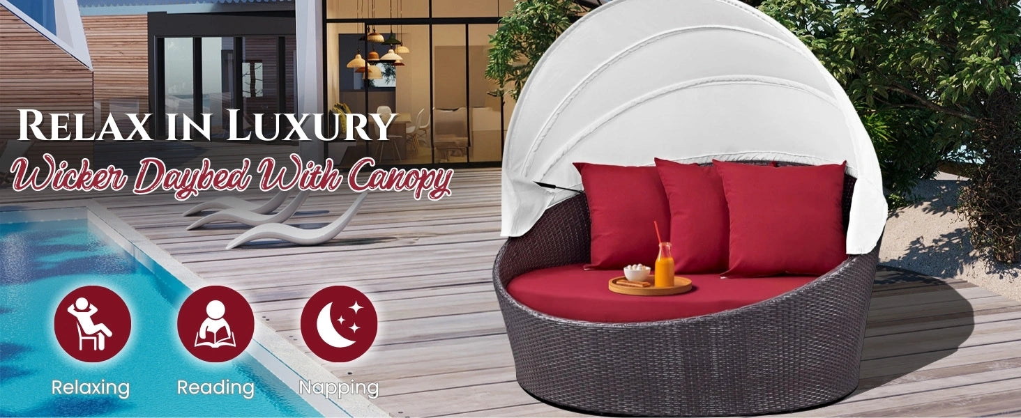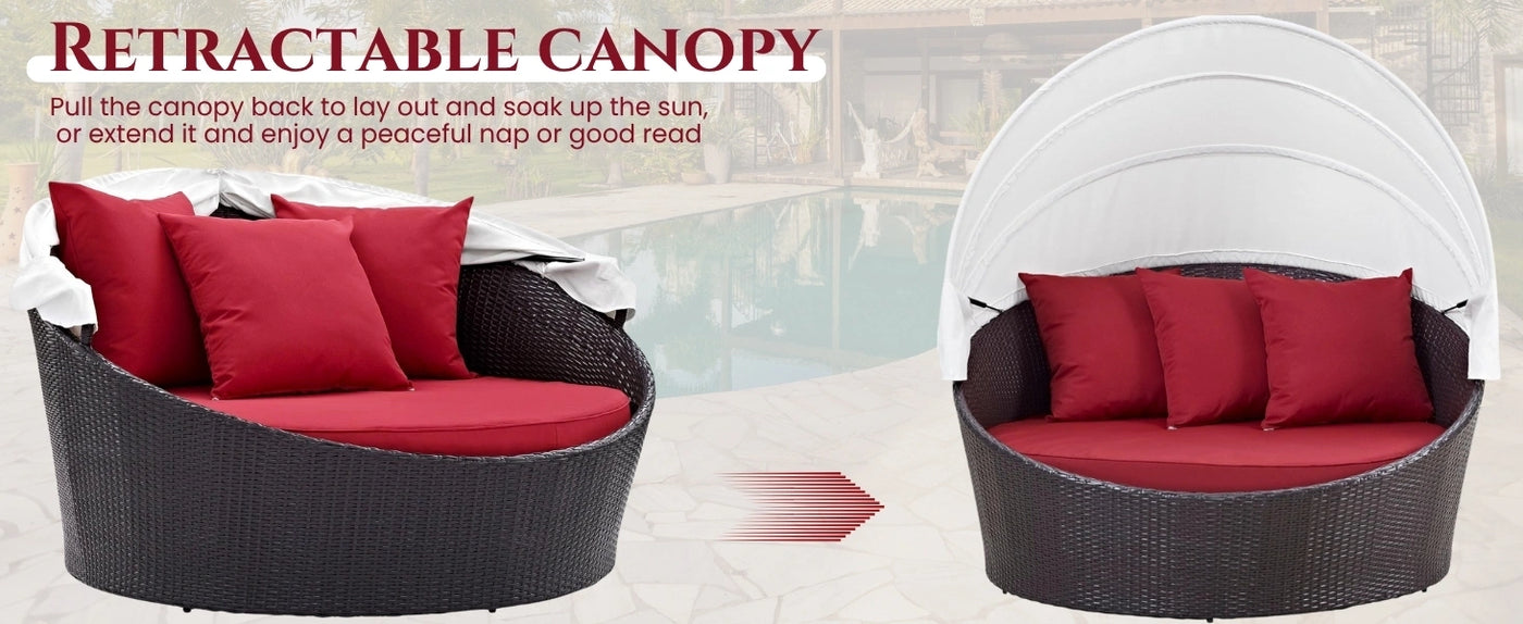 Transform your outdoor space into a luxurious retreat with this Outdoor Rattan Wicker Patio Daybed with Canopy. Crafted from durable, weather-resistant rattan and supported by a rustproof powder-coated metal frame, this stylish daybed is built to withstand sun, rain, and daily wear perfect for year-round use in your poolside, garden, deck, or lawn. Designed for comfort and relaxation, it features thick, high-density cushions with removable, washable covers for easy maintenance. The retractable canopy provides adjustable shade and UV protection, allowing you to relax in comfort whether you're soaking up the sun or enjoying a shaded nap. With its elegant curved design and spacious seating, this daybed offers a resort-like experience at home. Ideal for lounging, reading, or entertaining guests outdoors, it’s the ultimate blend of functionality and style.
