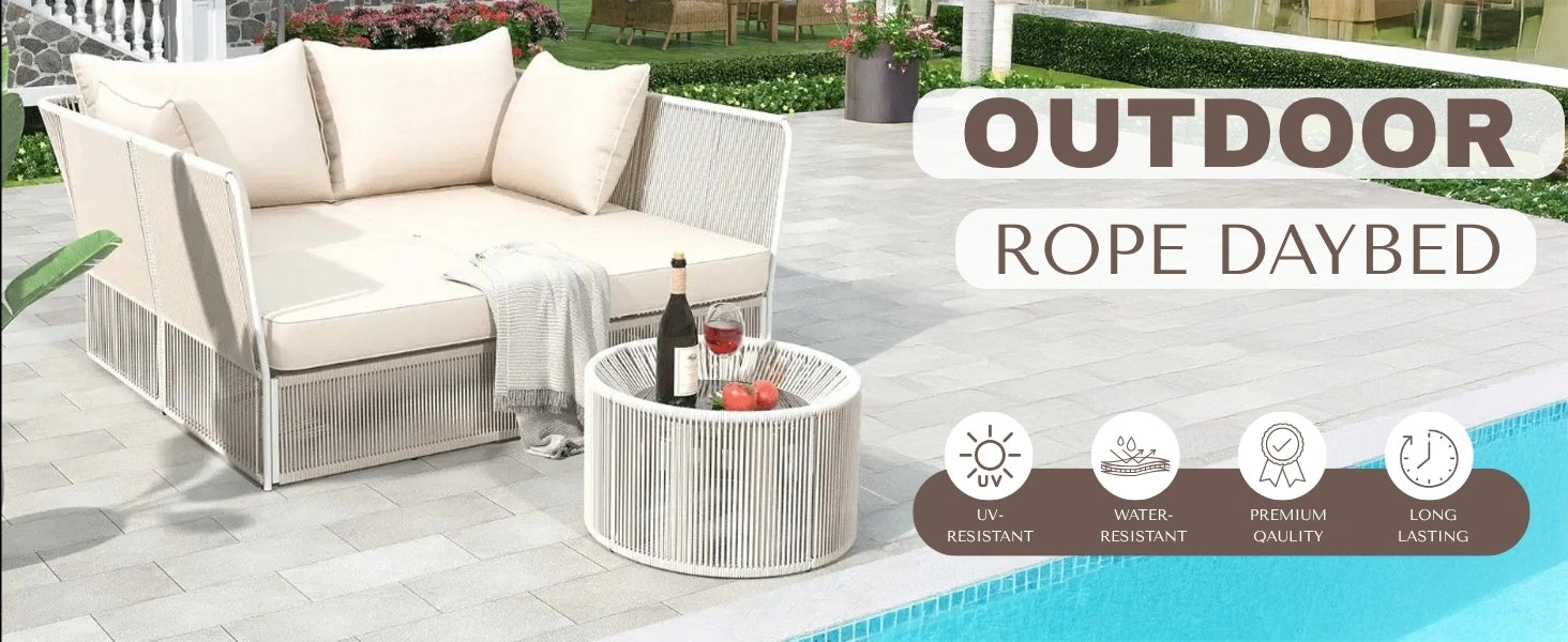 - Premium Handwoven Rope Detailing : The chaise and daybed are meticulously wrapped in UV-resistant weather proof rope that resists fading, fraying, or damage, offering a stylish yet robust alternative to traditional rattan.