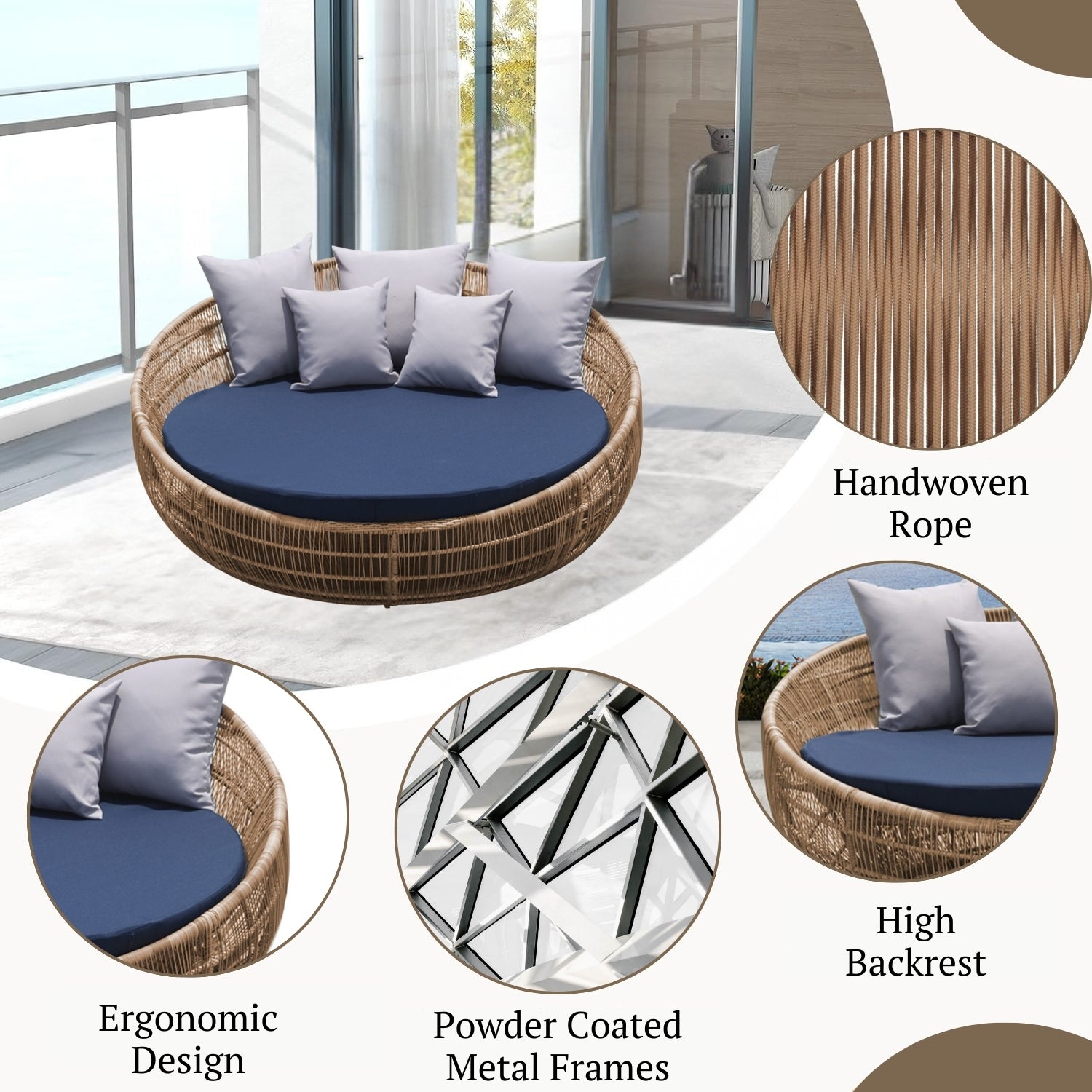 Elevate your outdoor space with this Unique Round Rope Sofa Daybed, designed for modern comfort and striking style. Perfect for poolside, garden, balcony, porch, terrace, patio, or beachside relaxation, this daybed features a contemporary circular design in elegant tones to complement any outdoor décor. Expertly crafted with a durable powder-coated frame and handwoven all-weather rope, it resists sun, rain, and moisture—ideal for year-round use. The thick, high-density cushions provide cloud-like comfort and are upholstered in water-resistant, easy-to-clean fabric for worry-free lounging. Its ergonomic high-backrest and spacious seating offer both support and room to unwind, whether you're sunbathing, reading, or enjoying evening chats outdoors. Lightweight yet sturdy, this rope daybed blends form, function, and flexibility in one stylish statement piece.
