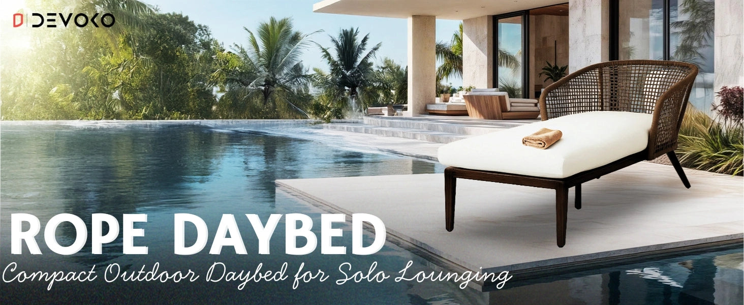 Elevate your outdoor space with this stylish and durable Outdoor Rope Patio Daybed, designed for ultimate relaxation and modern aesthetics. Crafted with a sturdy powder-coated metal frame and handwoven weather-resistant rope, this daybed offers exceptional durability to withstand all seasons. The ergonomically curved high backrest provides excellent support, while the thick, soft cushion adds cloud-like comfort for long hours of lounging. Perfect for gardens, terraces, backyards, or balconies, this outdoor daybed combines luxury and practicality in one elegant piece. Its breathable design ensures airflow, preventing heat buildup on sunny days. The removable, washable cushion covers make maintenance easy, keeping your space looking fresh and inviting. Whether you're sunbathing, reading, or hosting guests, this versatile daybed adds a touch of sophistication to any outdoor setting.