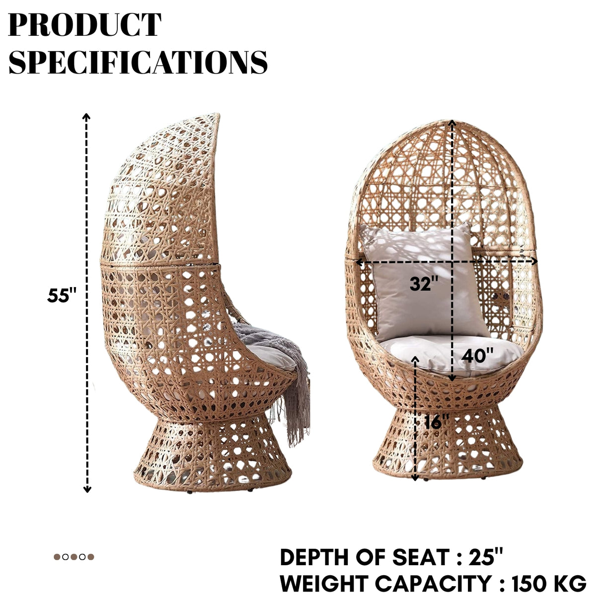 Elevate your outdoor living with this Beige Rattan Wicker Cocoon Chair, a perfect blend of style, comfort, and durability. Handwoven with premium all-weather rattan in a timeless beige finish, this cocoon chair creates a cozy retreat for relaxation on the garden, deck, lawn, poolside, or balcony. Its spacious design and soft cushions provide cloud-like comfort, while the sturdy powder-coated frame ensures stability and long-lasting use. Designed to withstand outdoor elements without compromising on elegance, this chair enhances any space with its modern yet inviting look making it an ideal choice for discerning homeowners who value both functionality and aesthetics.