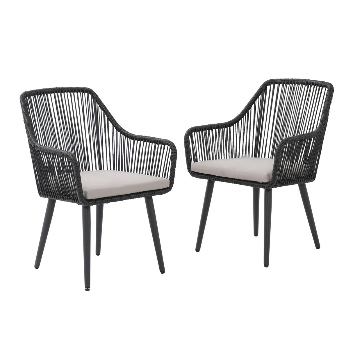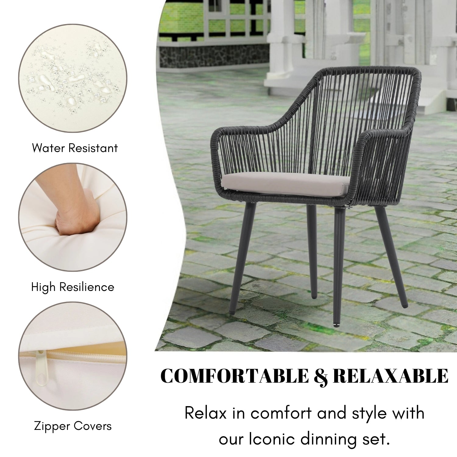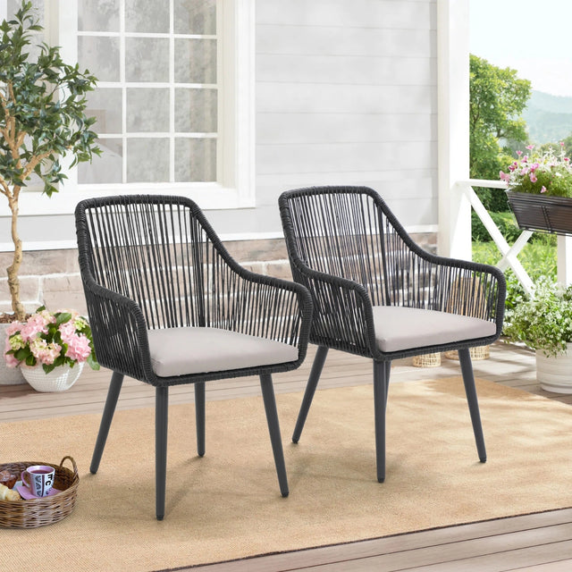 Elevate your outdoor dining experience with these stylish rope dining chairs featuring plush cushions for unmatched comfort. Expertly crafted with a powder-coated metal frame and handwoven weather-resistant rope, these chairs are built to withstand the elements while maintaining their elegant appeal. The breathable rope design ensures proper airflow, keeping you cool during warm days, while the soft, water-resistant cushions provide long-lasting seating comfort. Perfect for gardens, decks, lawns, and poolside settings, these chairs blend contemporary charm with durable performance. Their lightweight yet sturdy construction allows for easy mobility without compromising stability, making them a versatile addition to any outdoor space.