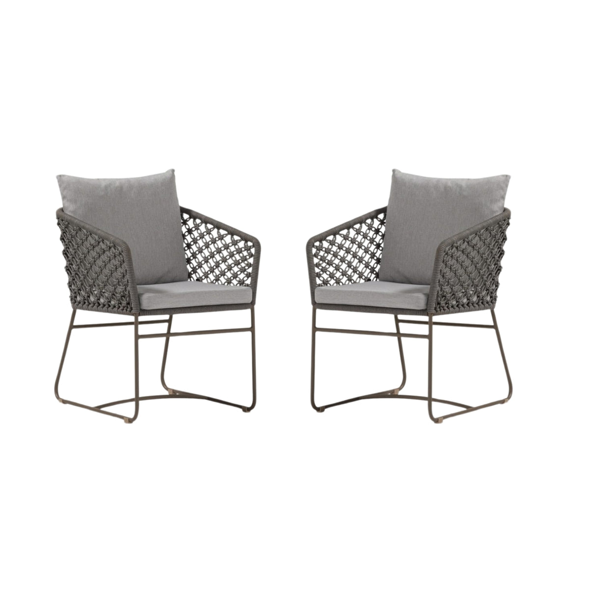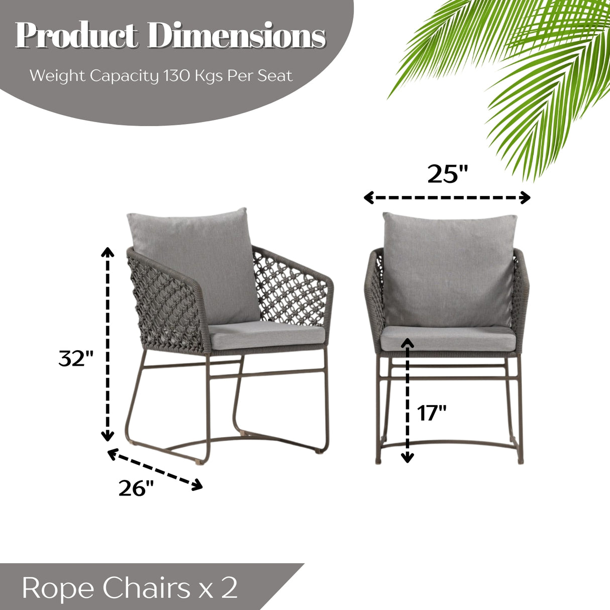 Elevate your outdoor dining experience with these stylish rope patio chairs featuring plush cushions for unmatched comfort. Expertly crafted with a powder-coated metal frame and handwoven weather-resistant rope, these chairs are built to withstand the elements while maintaining their elegant appeal. The breathable rope design ensures proper airflow, keeping you cool during warm days, while the soft, water-resistant cushions provide long-lasting seating comfort. Perfect for gardens, decks, lawns, and poolside settings, these chairs blend contemporary charm with durable performance. Their lightweight yet sturdy construction allows for easy mobility without compromising stability, making them a versatile addition to any outdoor space.