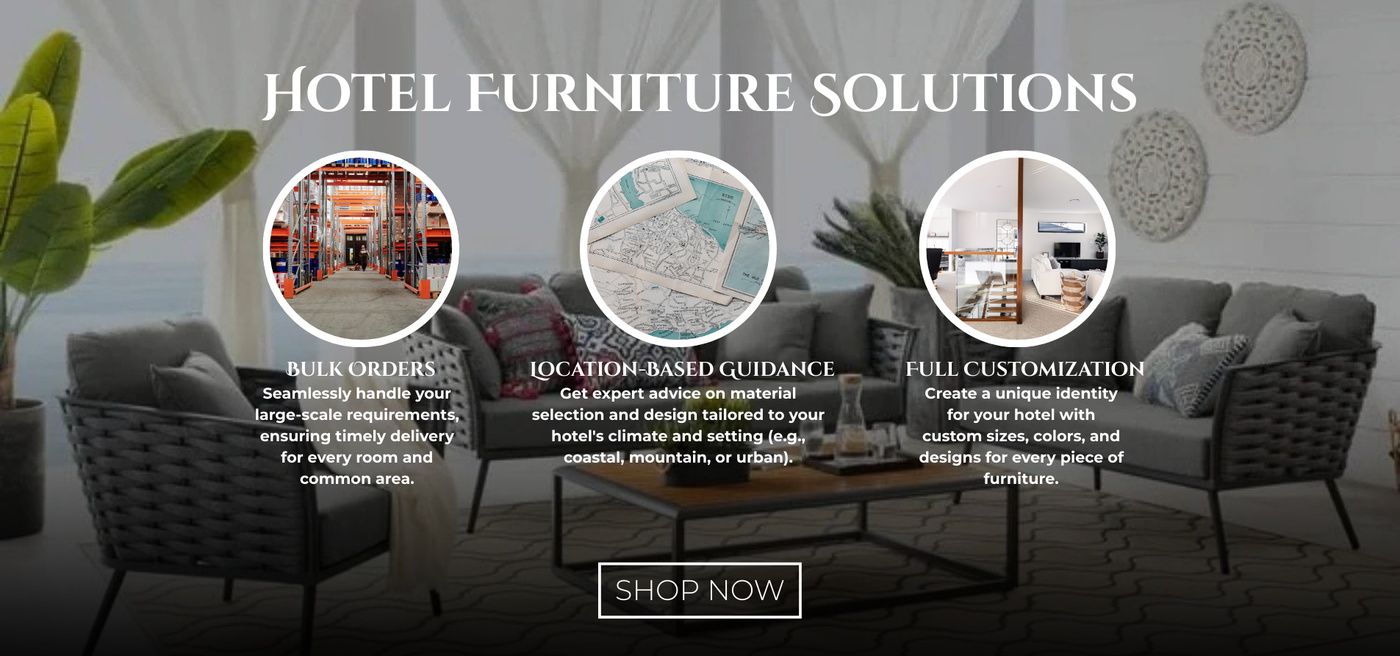 We provide a seamless and professional experience for your business. We specialize in fulfilling bulk orders with efficient, on-time delivery. Our team offers expert guidance on material selection and design, specifically tailored to your hotel's location and climate . Furthermore, our complete customization options —from design to finish—allow you to create a unique and cohesive identity that perfectly matches your brand and vision.