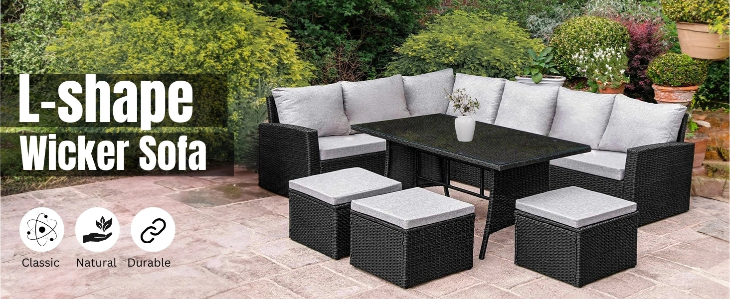 Elevate your outdoor living with this stunning 6-piece Wicker Rattan Furniture Set, thoughtfully crafted to bring modern style, lasting comfort, and practical elegance to your garden, patio, porch, or poolside. With its sleek frame and soft cushions, this set instantly adds a touch of sophistication to any setting, whether you're hosting guests or simply unwinding after a long day. Built with a durable handwoven wicker exterior over a rust-resistant powder-coated metal frame, this sectional set is made to withstand all weather conditions while retaining its beauty season after season. The ergonomic corner sofa design provides deep, cozy seating with thick, plush cushions that promise all-day comfort. The removable, washable cushion covers ensure easy cleaning and maintenance, so your outdoor oasis always looks fresh and inviting. At the center of it all is a matching glass-top coffee table, perfect for holding drinks, snacks, or décor, offering the ideal space for morning coffees or evening conversations under the stars.