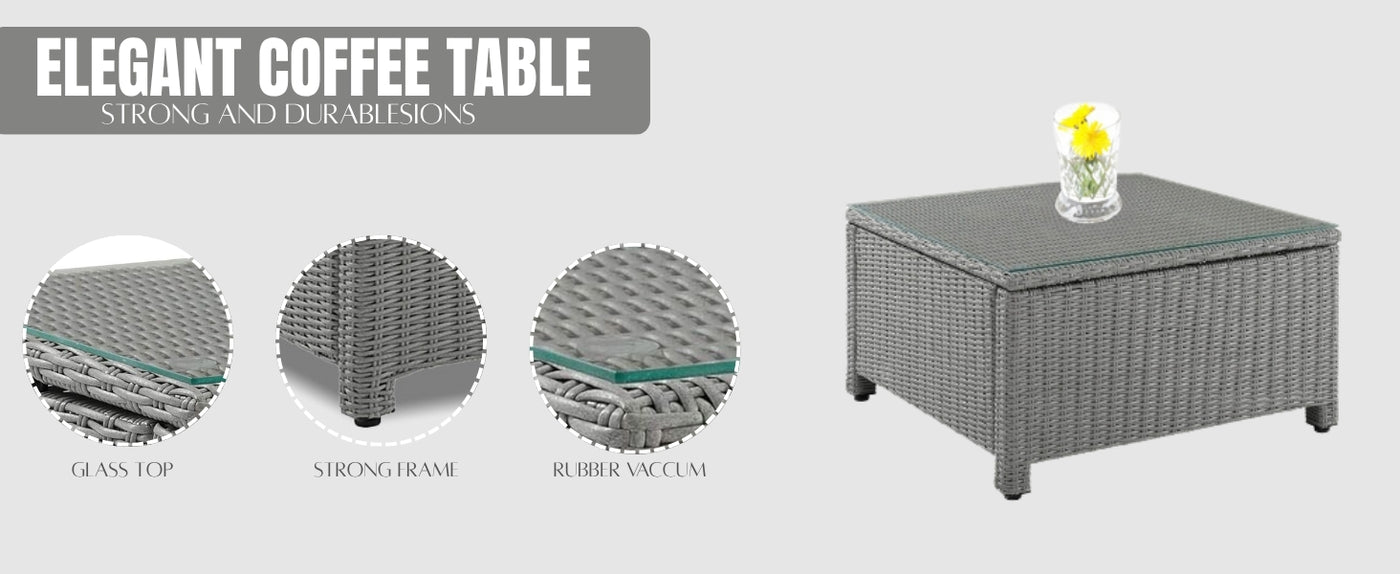 • Stylish & Functional Glass-Top Center Table : Includes a sleek and sturdy center table with a glass top perfect for serving drinks, snacks, or decor items outdoors.
