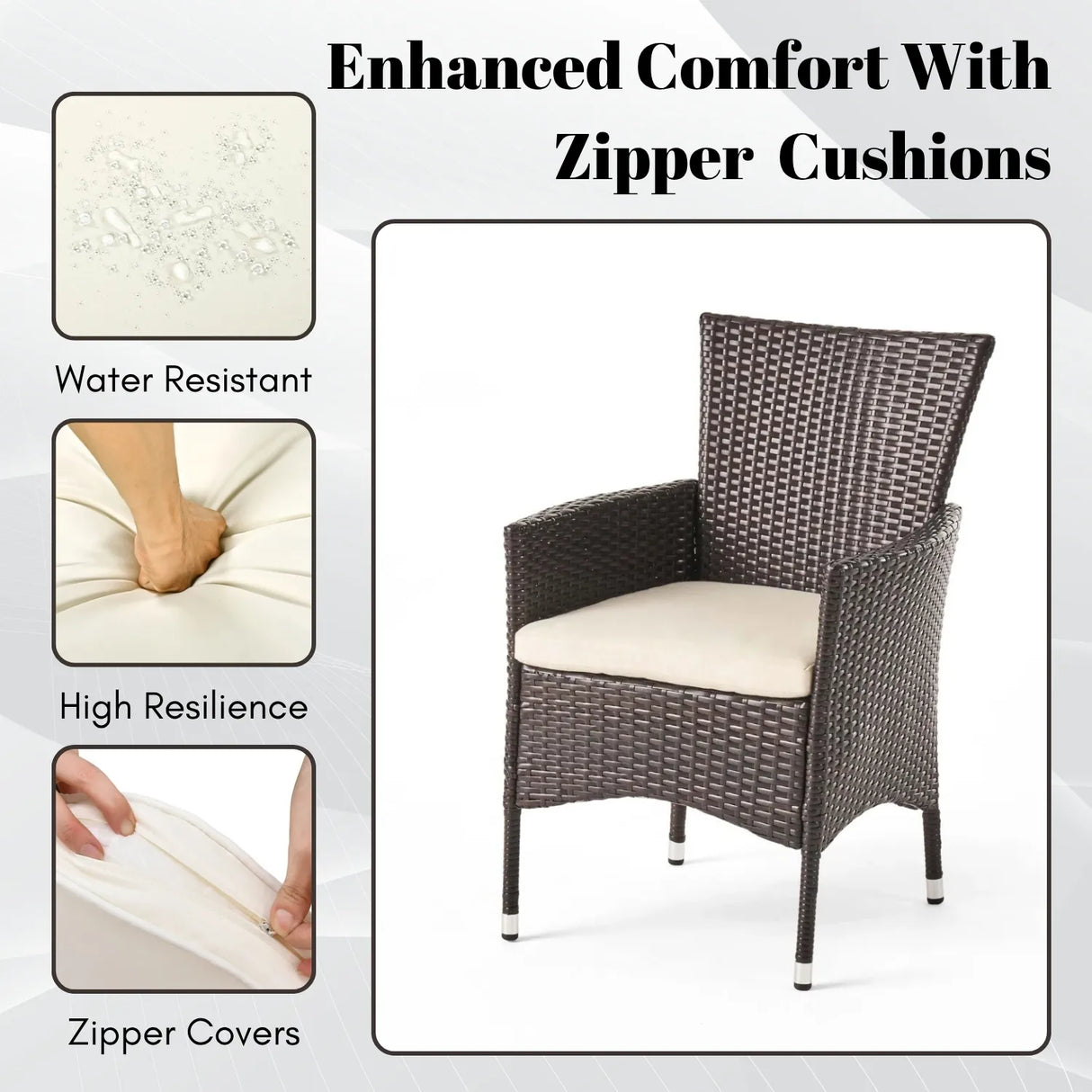 Elevate your outdoor dining experience with our expertly crafted Rattan Wicker Dining Chairs, designed for lasting comfort and style. Constructed with a durable powder-coated metal frame, these chairs offer exceptional strength and stability, making them ideal for everyday use in gardens, decks, lawns, or poolside settings. The handwoven all-weather HDPE rattan is UV-resistant and built to withstand harsh sun, rain, and humidity without fading or cracking ensuring long-term performance and beauty. Each chair features a high backrest and ergonomic armrests, promoting a naturally comfortable sitting posture. The addition of soft, breathable cushions with removable, water-resistant covers ensures maximum comfort and easy maintenance. Their sleek woven design and neutral tones blend seamlessly with any outdoor décor, adding a touch of modern elegance to your space. Whether you're enjoying casual breakfasts or evening gatherings, these lightweight yet sturdy dining chairs offer the perfect balance of durability, comfort, and visual appeal, making them a smart addition to any outdoor setting.