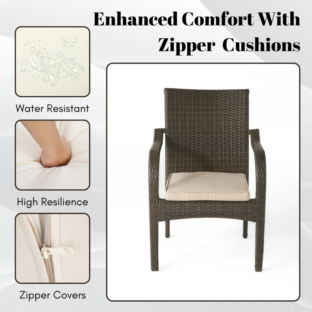 Elevate your outdoor dining experience with our expertly crafted Rattan Wicker Dining Chairs, designed for lasting comfort and style. Constructed with a durable powder-coated metal frame, these chairs offer exceptional strength and stability, making them ideal for everyday use in gardens, decks, lawns, or poolside settings. The handwoven all-weather HDPE rattan is UV-resistant and built to withstand harsh sun, rain, and humidity without fading or cracking—ensuring long-term performance and beauty. Each chair features a high backrest and ergonomic armrests, promoting a naturally comfortable sitting posture. The addition of soft, breathable cushions with removable, water-resistant covers ensures maximum comfort and easy maintenance. Their sleek woven design and neutral tones blend seamlessly with any outdoor décor, adding a touch of modern elegance to your space. Whether you're enjoying casual breakfasts or evening gatherings, these lightweight yet sturdy dining chairs offer the perfect balance of durability, comfort, and visual appeal, making them a smart addition to any outdoor setting.