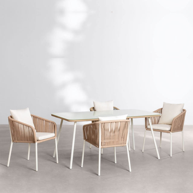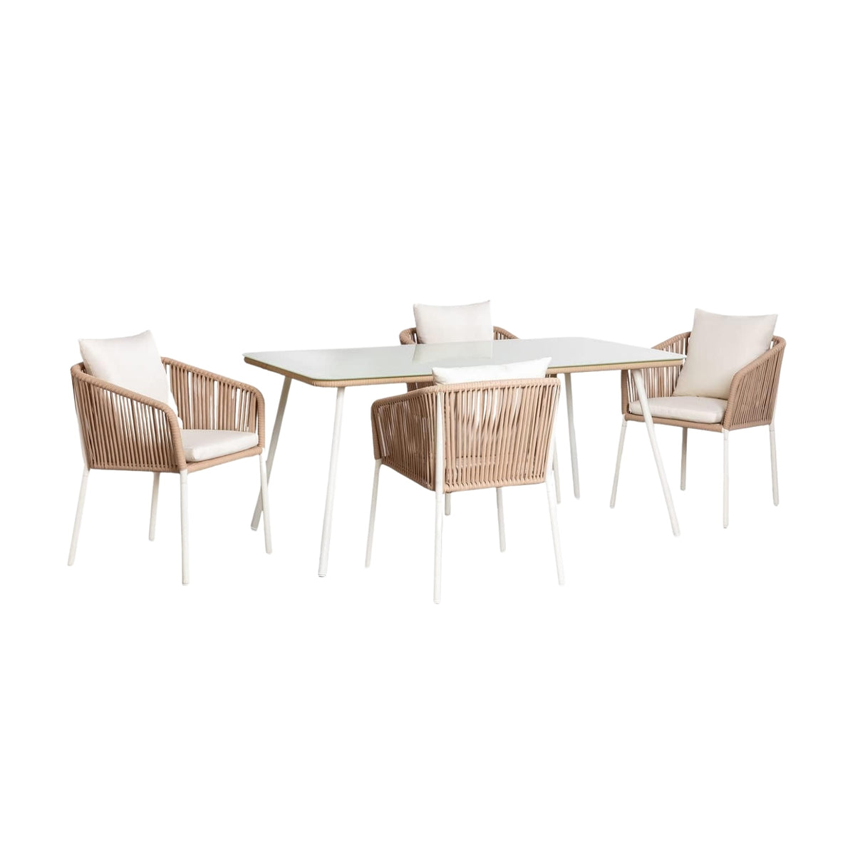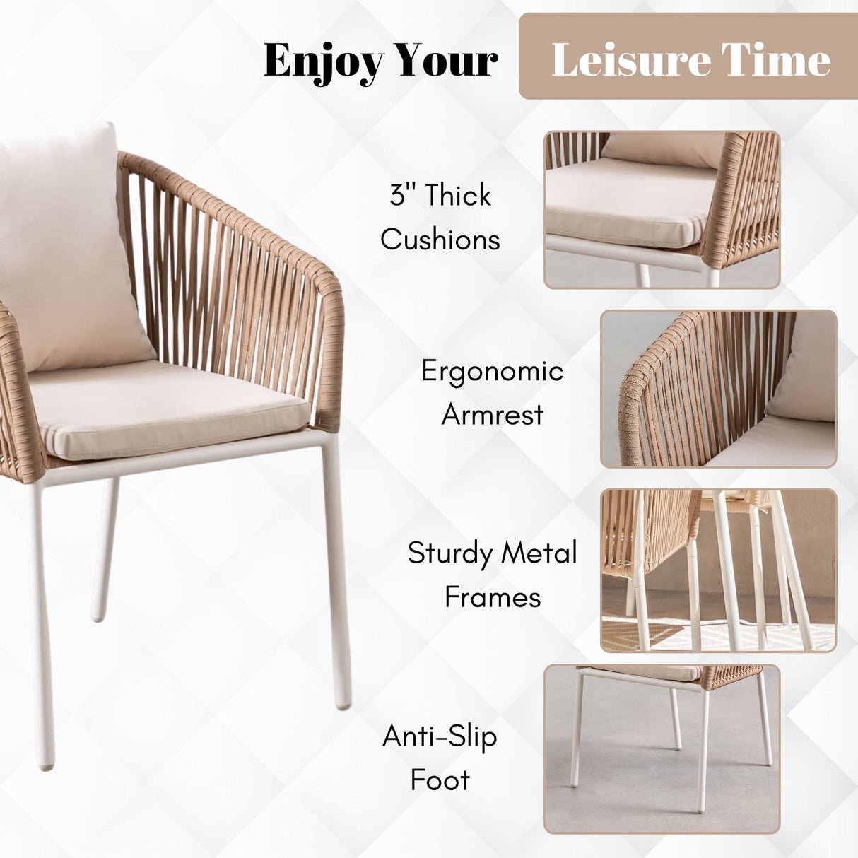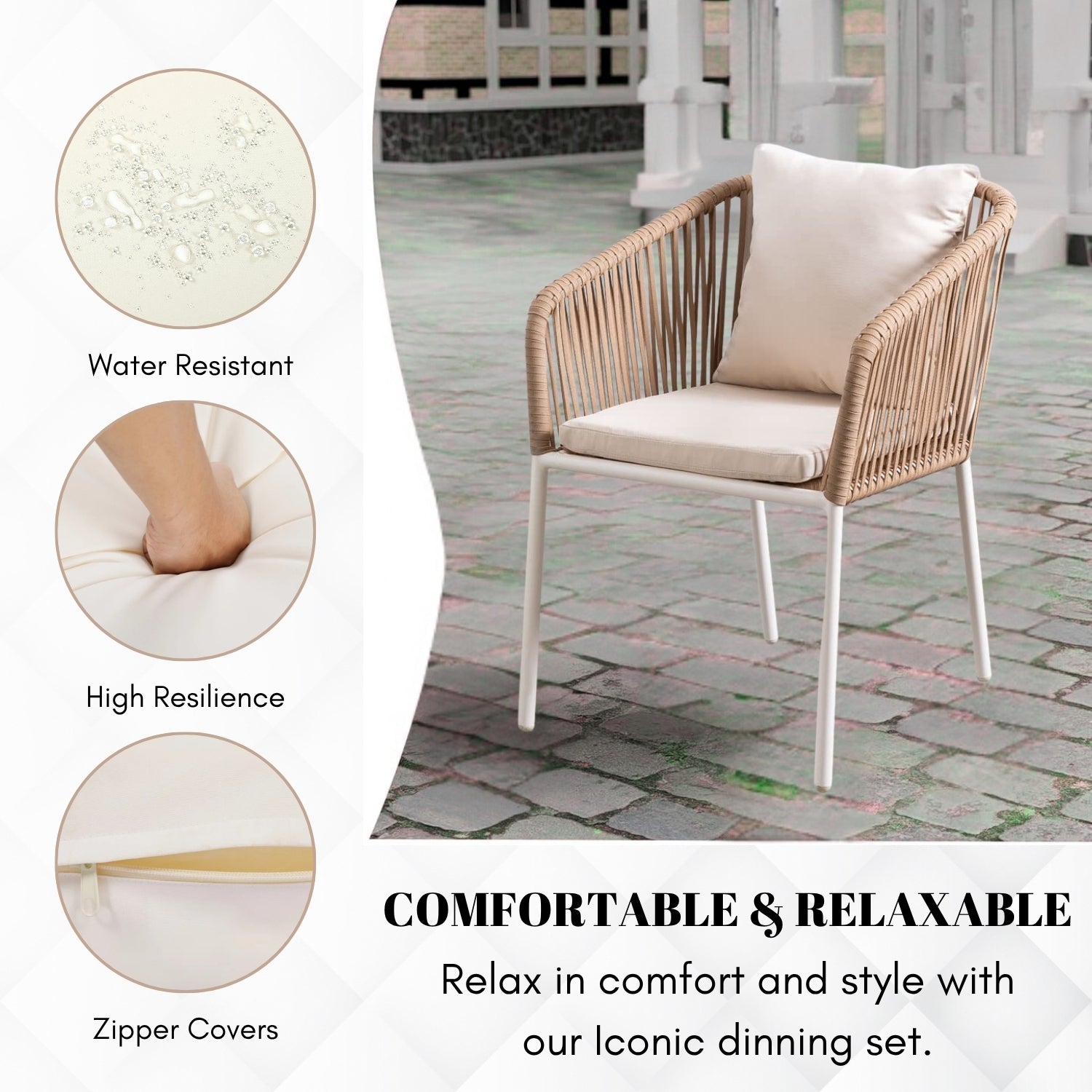 Upgrade your outdoor gatherings with this stylish 5-Piece Outdoor Patio Dining Set, featuring four handwoven rope chairs and table. Built for both durability and comfort, this all-weather set is perfect for your balcony, poolside, garden, or backyard. The weather-resistant rope ensures year-round use, while the powder-coated metal frame provides long-lasting strength and stability. Soft seat cushions offer added comfort for relaxing meals and conversations outdoors. The compact design fits well in smaller spaces while maintaining a modern, elegant look. Whether you're hosting friends or enjoying a quiet meal outdoors, this dining set offers a perfect blend of style, durability, and functionality for any patio setting.