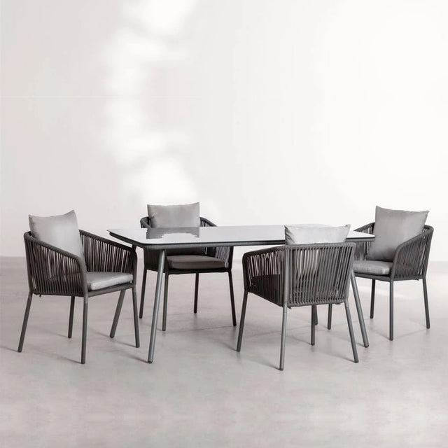 Upgrade your outdoor gatherings with this stylish 5-Piece Outdoor Patio Dining Set, featuring four handwoven rope chairs and table. Built for both durability and comfort, this all-weather set is perfect for your balcony, poolside, garden, or backyard. The weather-resistant rope ensures year-round use, while the powder-coated metal frame provides long-lasting strength and stability. Soft seat cushions offer added comfort for relaxing meals and conversations outdoors. The compact design fits well in smaller spaces while maintaining a modern, elegant look. Whether you're hosting friends or enjoying a quiet meal outdoors, this dining set offers a perfect blend of style, durability, and functionality for any patio setting.