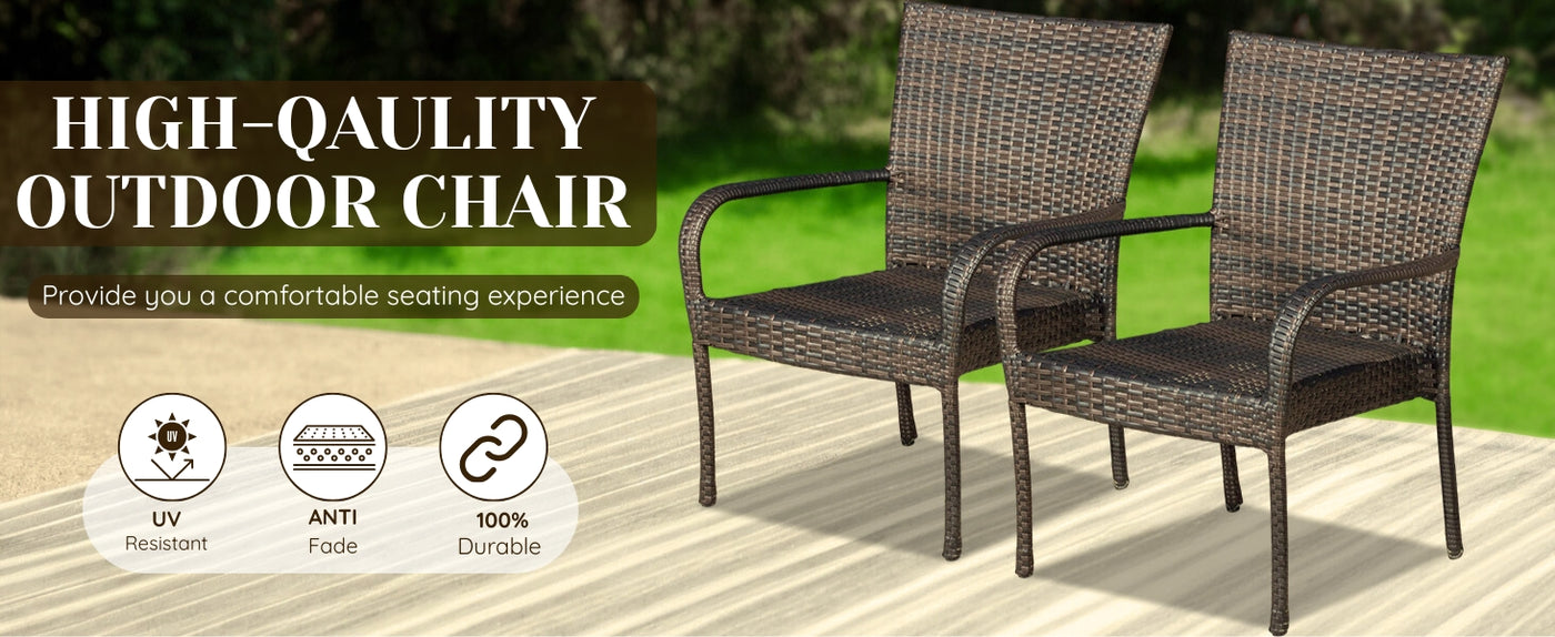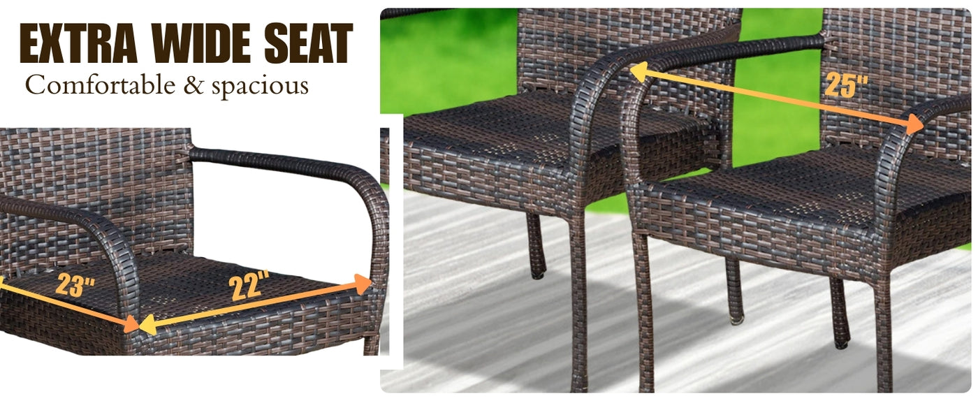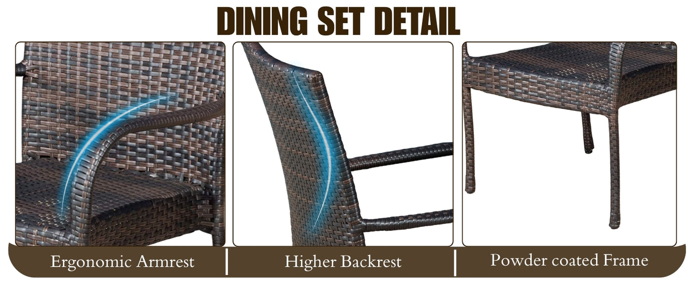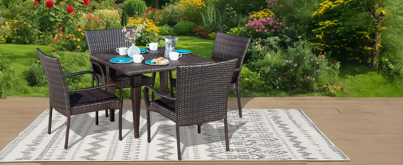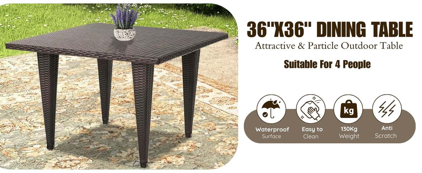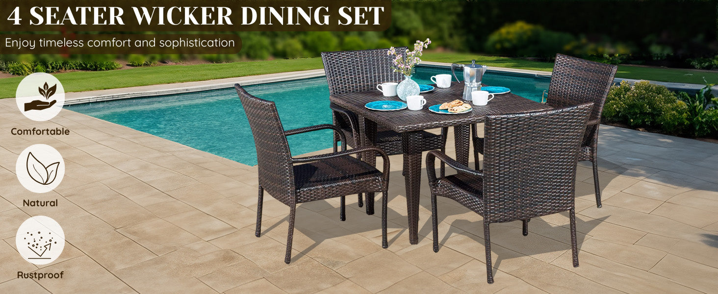Elevate your patio, garden, or balcony with the Outdoor All-Weather Resistant Rattan Wicker 5-Piece Dining Set in Dark Brown a perfect blend of durability, elegance, and everyday functionality. Crafted with premium handwoven rattan wicker and a rust-resistant powder-coated metal frame, this dining set is built to withstand all weather conditions be it rain, sun, or humidity making it ideal for year-round outdoor use. This stylish set includes one spacious dining table with a smooth, wicker top for easy cleaning and four ergonomically designed chairs that deliver lasting comfort. Whether you're enjoying a quiet morning coffee or hosting a weekend brunch, this set offers a welcoming spot for every occasion. Designed to suit modern lifestyles, its compact footprint fits comfortably in smaller spaces without compromising style. The rich dark brown finish adds a sophisticated touch to any setting.