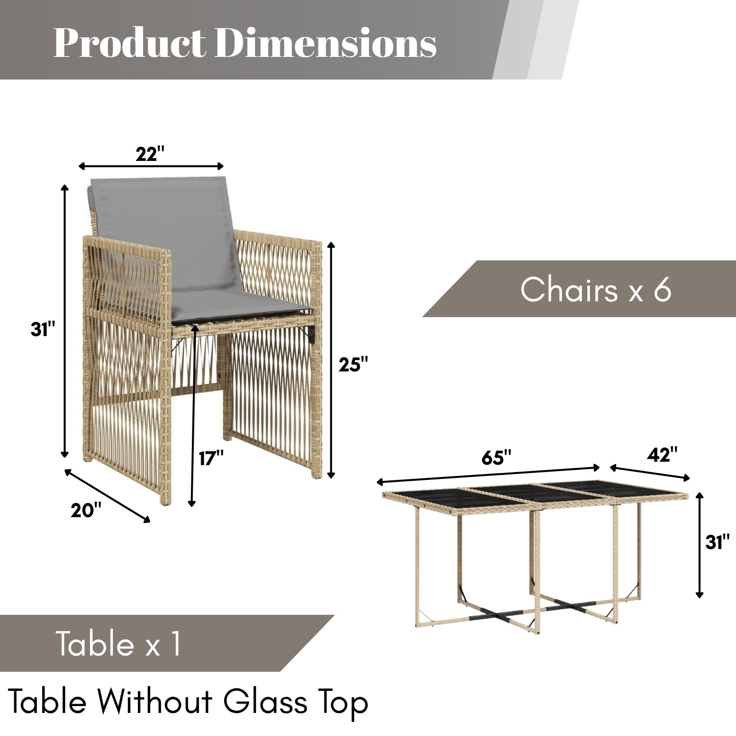 Create a stylish and functional outdoor dining space with this 7-Piece Outdoor Patio Rattan Dining Set, featuring a table and 8 cushioned chairs. Designed for comfort and built for durability, this set is perfect for gardens, balconies, poolside lounges, or backyard gatherings. Crafted with weather-resistant HDPE rattan and a rustproof powder-coated metal frame, it offers year-round durability against UV rays, rain, and fading. The tabletop provides a modern touch and easy maintenance, while the plush, removable seat cushions ensure long-lasting comfort and support. With a space-saving stackable design, this outdoor dining set combines style, function, and comfort ideal for hosting friends and family outdoors.