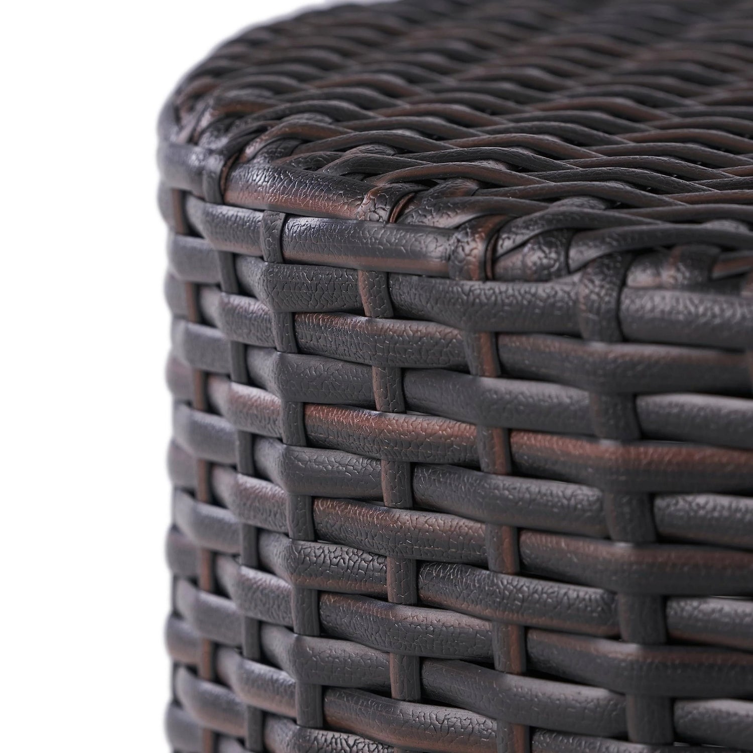 Elevate your outdoor space with the timeless charm and practicality of the Dark Brown Wicker Garden Bistro End Table. Expertly handwoven with premium all-weather HDPE wicker, this elegant end table adds a touch of rustic sophistication to any garden, balcony, or patio setting. Its rich dark brown hue blends beautifully with natural surroundings while complementing a wide variety of outdoor furniture styles. Built for durability, the sturdy powder-coated metal frame ensures long-lasting performance and resistance to rust, moisture, and fading. The compact yet functional design makes it perfect for holding beverages, snacks, or decorative items during outdoor lounging or gatherings.