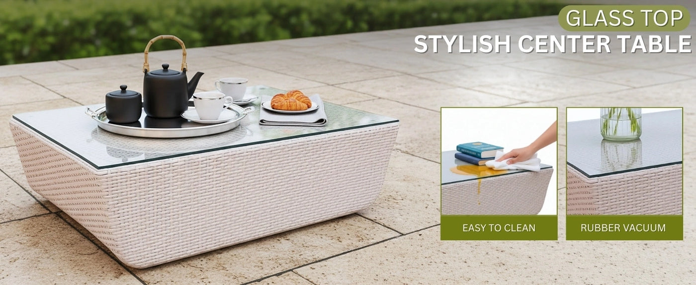 Transform your outdoor space into a cozy and stylish retreat with this 4 PCS Patio Wicker Furniture Set. Whether you're relaxing with a morning coffee, hosting guests in your backyard, or unwinding on your balcony after a long day, this modern rattan set offers the perfect blend of comfort, durability, and sophisticated design. Crafted with weather-resistant, hand-woven wicker over a strong powder-coated metal frame, this set is built to withstand the elements without fading, cracking, or rusting making it ideal for year-round outdoor use. The set includes two ergonomically designed single chairs, one spacious double-seater, and a sleek center table with a glass top, providing ample space for drinks, snacks, or décor. Each seat comes with plush, high-density green cushions that are not only soft and supportive but also feature removable and washable covers for easy maintenance. The neutral color palette complements any outdoor décor, from minimalist balconies to lush garden patios.