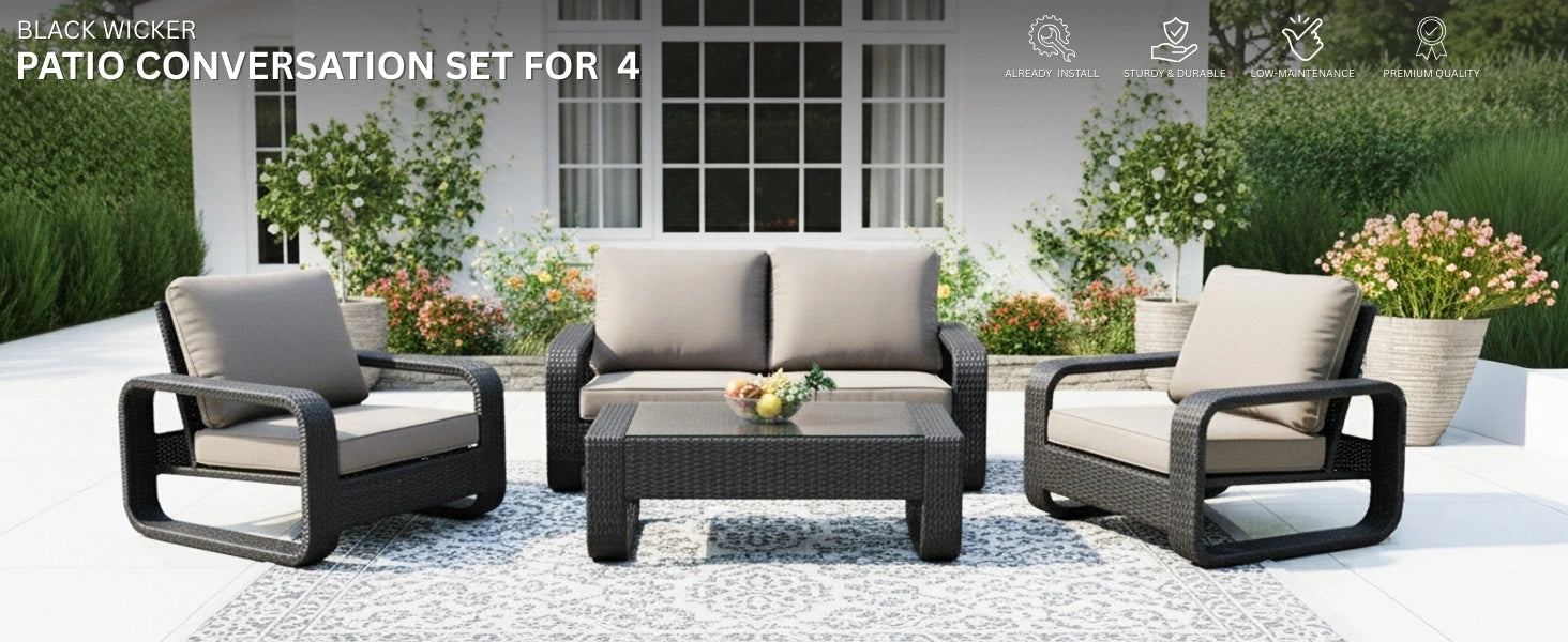Transform your outdoor space into a cozy and stylish retreat with this 4 PCS Patio Wicker Furniture Set is elegant. Whether you're relaxing with a morning coffee, hosting guests in your backyard, or unwinding on your balcony after a long day, this modern rattan set offers the perfect blend of comfort, durability, and sophisticated design. Crafted with weather-resistant, hand-woven wicker over a strong powder-coated metal frame, this set is built to withstand the elements without fading, cracking, or rusting making it ideal for year-round outdoor use. The set includes two ergonomically designed single chairs, one spacious double-seater, and a sleek center table with a glass top, providing ample space for drinks, snacks, or décor. Each seat comes with plush, high-density grey cushions that are not only soft and supportive but also feature removable and washable covers for easy maintenance. The neutral color palette complements any outdoor décor, from minimalist balconies to lush garden patios.