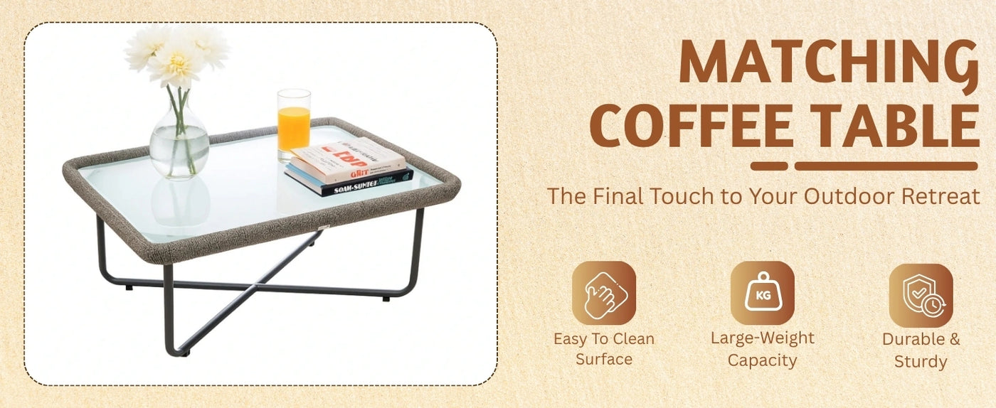 Crafted for comfort and built to last, this furniture set is the perfect blend of functionality and contemporary design, making it ideal for your garden, patio, balcony, or poolside. The sofa features premium handwoven rope detailing, supported by a sturdy, rust-resistant powder-coated metal frame that stands up to all weather conditions. The thick, soft all-weather cushions in grey provide plush seating comfort and are equipped with washable covers for easy maintenance. Whether you're lounging on a lazy afternoon or hosting guests under the stars, the ergonomic backrest and wide seating ensure maximum relaxation. The set includes a sleek glass-top center table that adds a touch of sophistication while offering ample space for drinks, snacks, or décor. The glass surface is both stylish and easy to clean, making it perfect for everyday outdoor use.