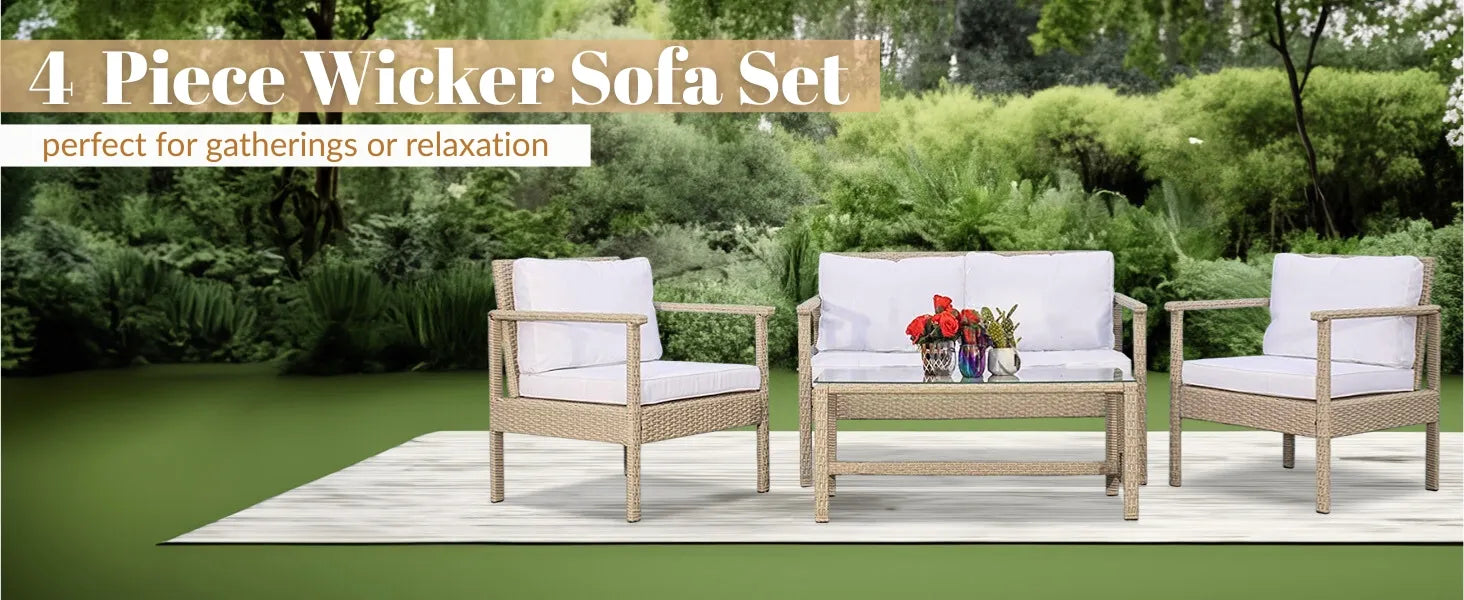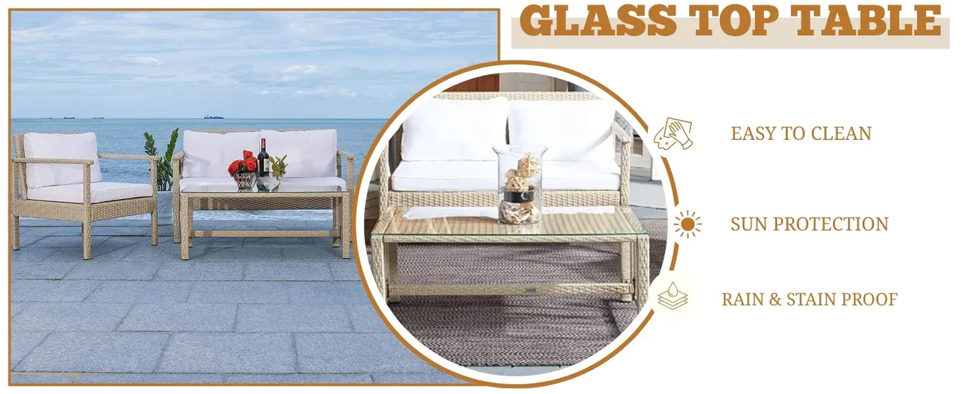 Elevate your garden, balcony, or backyard with this elegant 4-Piece Outdoor Patio Furniture Sofa Set a perfect blend of comfort, durability, and style. Crafted with premium all-weather handwoven wicker rattan, this conversation set is designed to withstand the elements while offering timeless charm in beige and white tones that blend effortlessly with any outdoor décor. The set includes two spacious single chairs, a wide loveseat, and a sturdy glass-top center table, making it ideal for entertaining guests, enjoying a quiet morning coffee, or relaxing with your family in the fresh air. Each seating piece comes with soft, washable cushions that are not only water resistant but also ultra-comfortable inviting you to sit back, relax, and unwind.