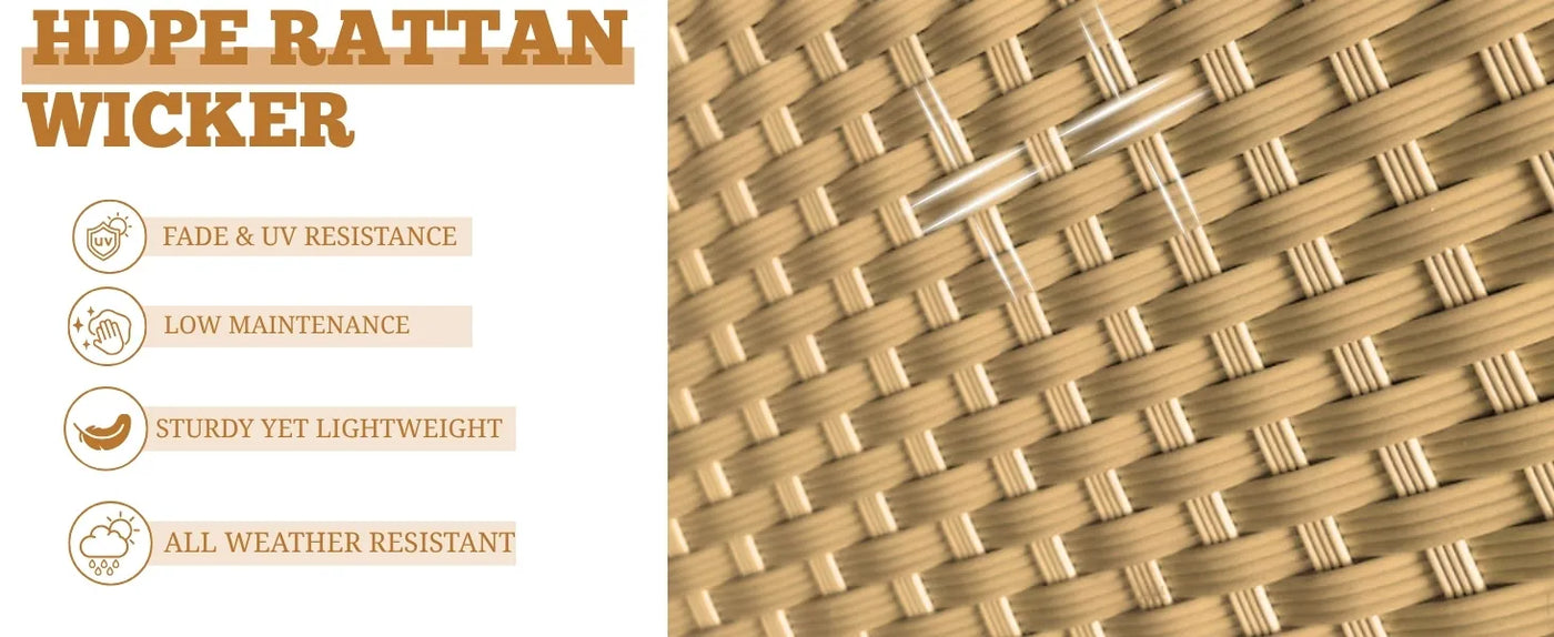 - All-Weather Wicker Rattan Construction : Crafted with handwoven premium synthetic rattan, the set is UV-resistant, fade-proof, and designed to withstand rain and sun perfect for year-round outdoor use.
