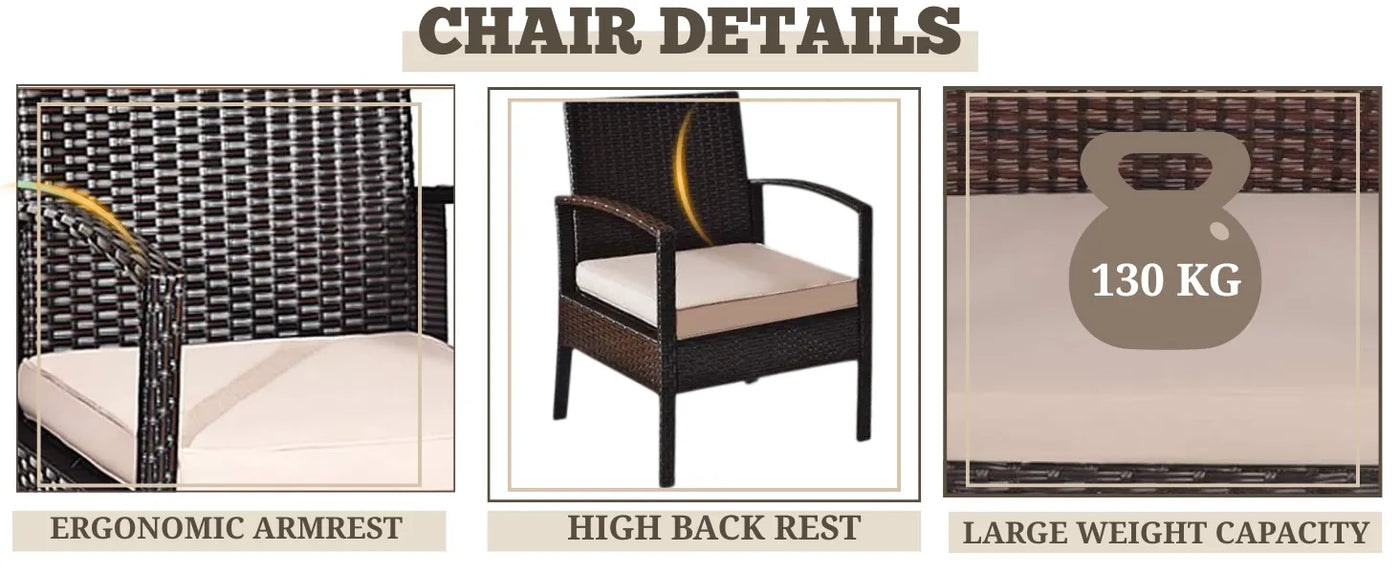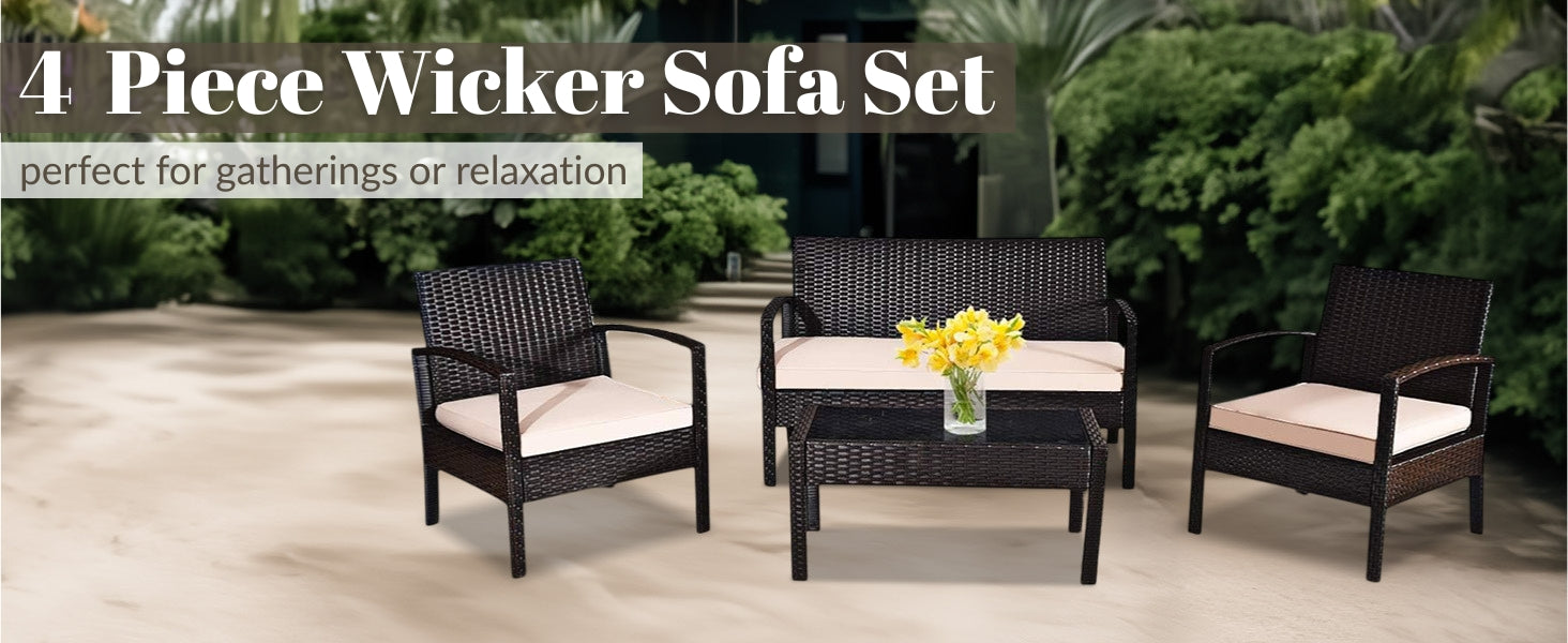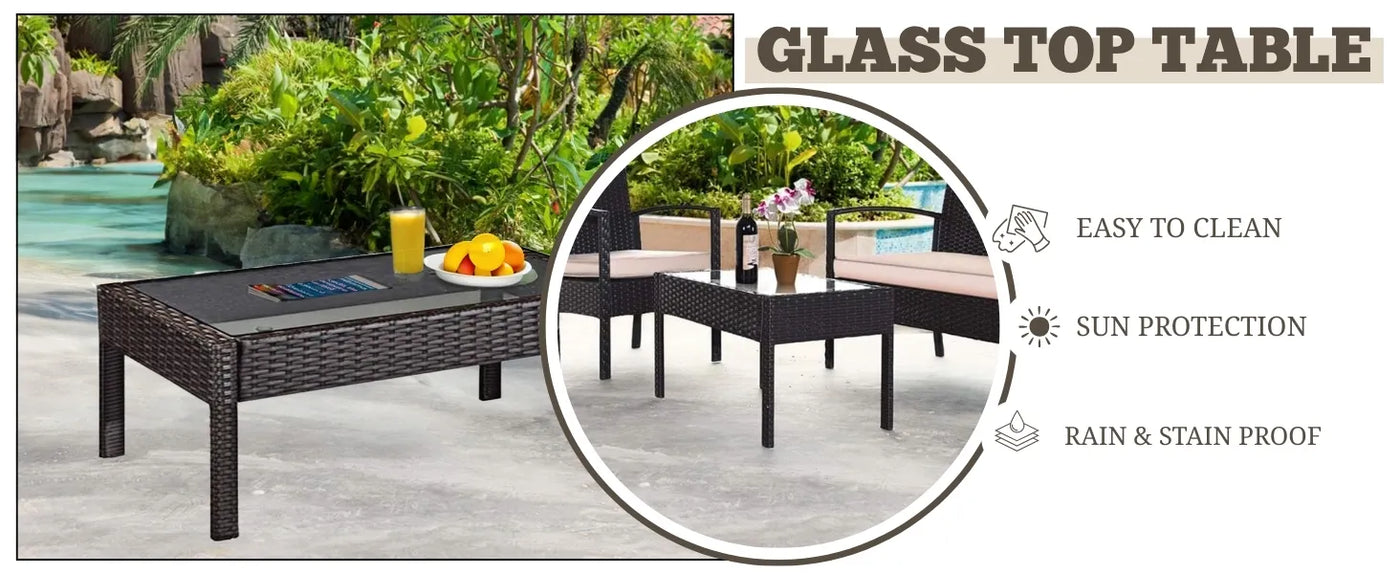 Transform your outdoor space into a stylish and relaxing retreat with this 4-Piece Patio Furniture Set. Designed with elegance, durability, and comfort in mind, this versatile rattan wicker conversation set is perfect for your porch, lawn, garden, balcony, or backyard. Whether you're enjoying your morning coffee, hosting a weekend gathering, or simply unwinding after a long day, this outdoor sectional sofa set brings comfort and charm to any setting. Crafted from high-quality handwoven rattan wicker and supported by a rust-resistant powder-coated metal frame, this set is built to withstand the elements while maintaining its visual appeal. The thick, soft cream cushions offer superior comfort, with removable and washable covers that make cleaning effortless. The center table features a glass top, providing a sleek and stable surface for drinks, snacks, or décor.