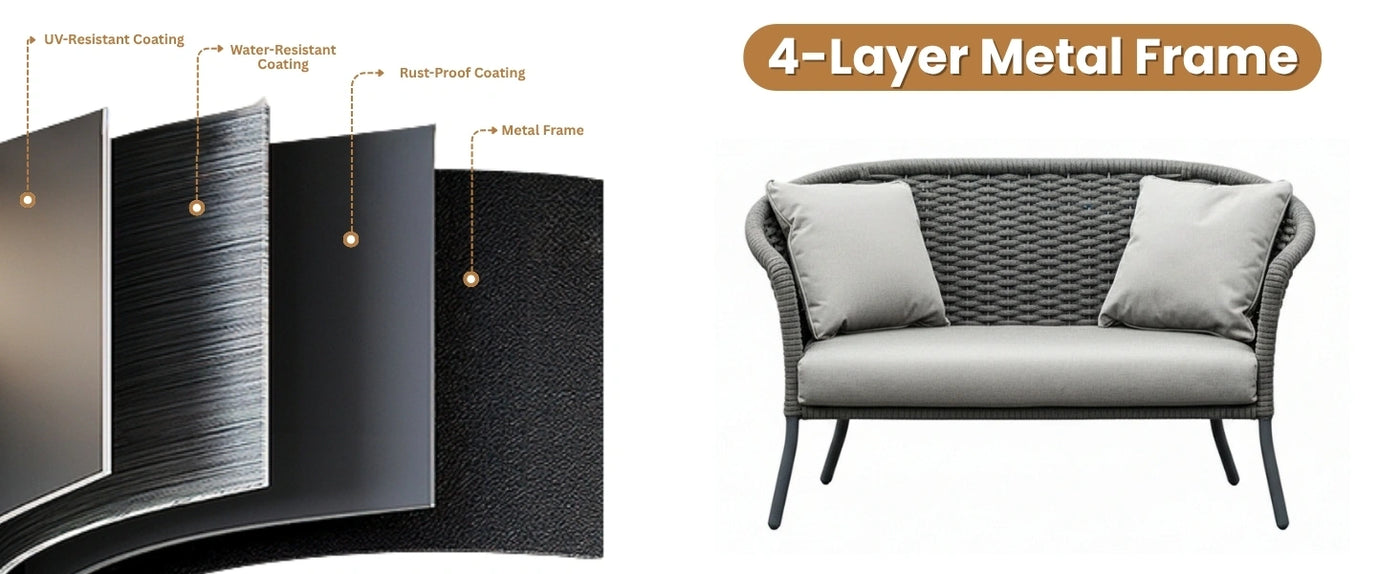Crafted for comfort and built to last, this furniture set is the perfect blend of functionality and contemporary design, making it ideal for your garden, patio, balcony, or poolside. The sofa features premium handwoven rope detailing, supported by a sturdy, rust-resistant powder-coated metal frame that stands up to all weather conditions. The thick, soft all-weather cushions in grey provide plush seating comfort and are equipped with washable covers for easy maintenance. Whether you're lounging on a lazy afternoon or hosting guests under the stars, the ergonomic backrest and wide seating ensure maximum relaxation. The set includes a sleek glass-top center table that adds a touch of sophistication while offering ample space for drinks, snacks, or décor. The glass surface is both stylish and easy to clean, making it perfect for everyday outdoor use.