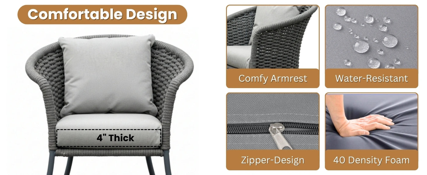 - Modern Coastal Design : Elegant grey rope weave and soft-toned cushions create a stylish, contemporary look for any outdoor setting.
