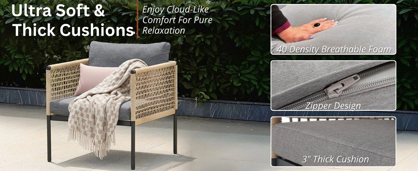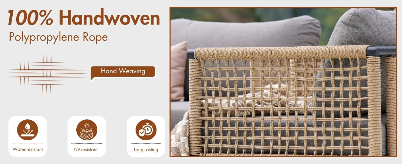 - Modern Coastal Design : Elegant rope weave and soft-toned cushions create a stylish, contemporary look for any outdoor setting.