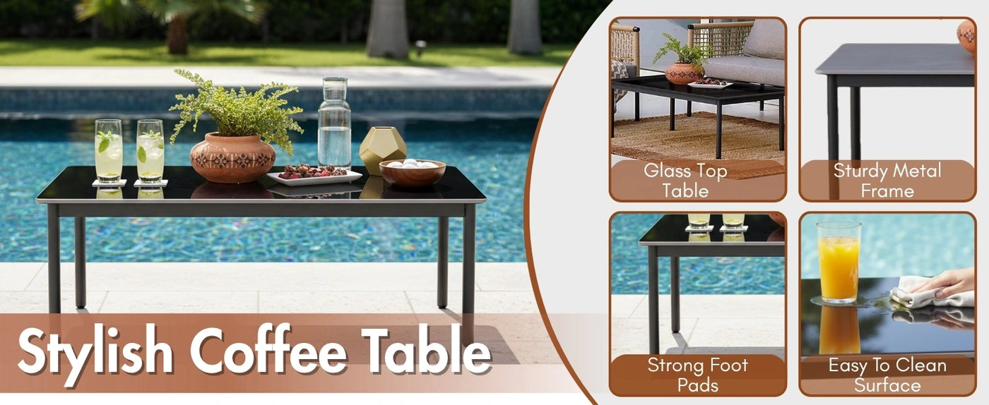 Crafted for comfort and built to last, this furniture set is the perfect blend of functionality and contemporary design, making it ideal for your garden, patio, balcony, or poolside. The sofa features premium handwoven rope detailing, supported by a sturdy, rust-resistant powder-coated metal frame that stands up to all weather conditions. The thick, soft all-weather cushions in grey provide plush seating comfort and are equipped with washable covers for easy maintenance. Whether you're lounging on a lazy afternoon or hosting guests under the stars, the ergonomic backrest and wide seating ensure maximum relaxation. The set includes a sleek glass-top center table that adds a touch of sophistication while offering ample space for drinks, snacks, or décor. The glass surface is both stylish and easy to clean, making it perfect for everyday outdoor use.