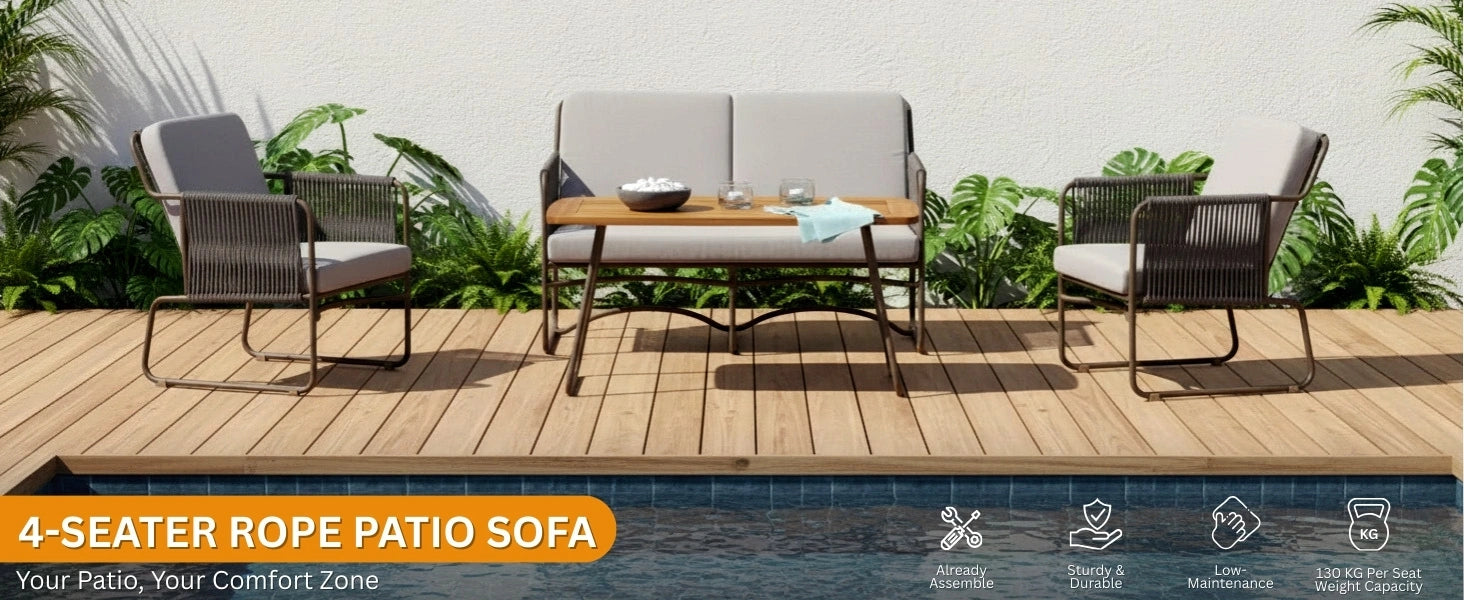 Bring style, comfort, and durability to your outdoor spaces with this beautifully crafted rope sofa set. Designed with a sturdy powder-coated metal frame and handwoven all-weather rope, it offers long-lasting strength and resistance against rust, fading, and moisture, making it ideal for year-round use. The elegant design features soft padded cushions with removable, washable covers, ensuring maximum comfort while maintaining a fresh, clean look. The centerpiece of the set is a modern wooden-top coffee table that not only provides stability but also enhances the overall aesthetic with a sleek and scratch-resistant finish. Whether placed in your garden, lawn, poolside, or terrace, this set creates a stylish seating area perfect for relaxing, entertaining, or enjoying a quiet evening outdoors. Blending functionality with contemporary elegance, this all-weather rope sofa set elevates any outdoor setting, offering both comfort and sophistication for your leisure time.