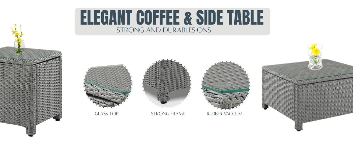 Bring luxury, comfort, and functionality to your patio with this Patio Furniture Set – Outdoor Sectional Sofa HDPE Wicker Conversation Set in Silver and Navy Blue. Designed to elevate any porch, lawn, garden, or backyard, this premium outdoor set blends contemporary aesthetics with long-lasting durability to create an inviting space for entertaining, relaxing, or simply enjoying the fresh air. Crafted from high-quality handwoven HDPE wicker, this sectional is not only beautiful but also built to withstand India’s diverse weather from harsh sun to heavy rain. The rustproof powder-coated metal frame ensures strength and stability, while the plush navy blue cushions offer cloud-like comfort with removable, washable covers for easy maintenance. The ergonomic design supports a relaxed posture, perfect for long conversations or weekend lounging. This versatile set includes a center table with a glass top ideal for serving snacks and drinks and a side table to keep essentials like books, candles, or plants within reach. Whether you're hosting a garden party or enjoying a quiet morning coffee, this set creates a cozy, modern oasis that reflects your personal style.
