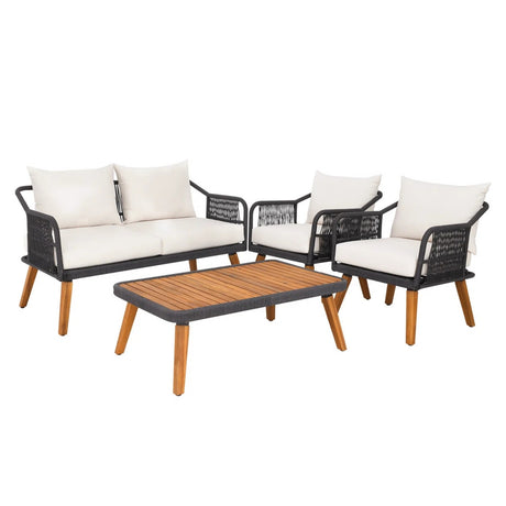 Outdoor Rope 4-Piece Sofa Set With Wooden Top T...