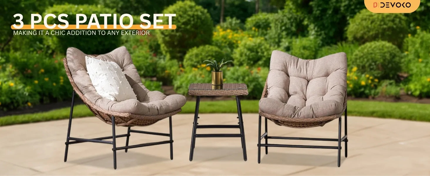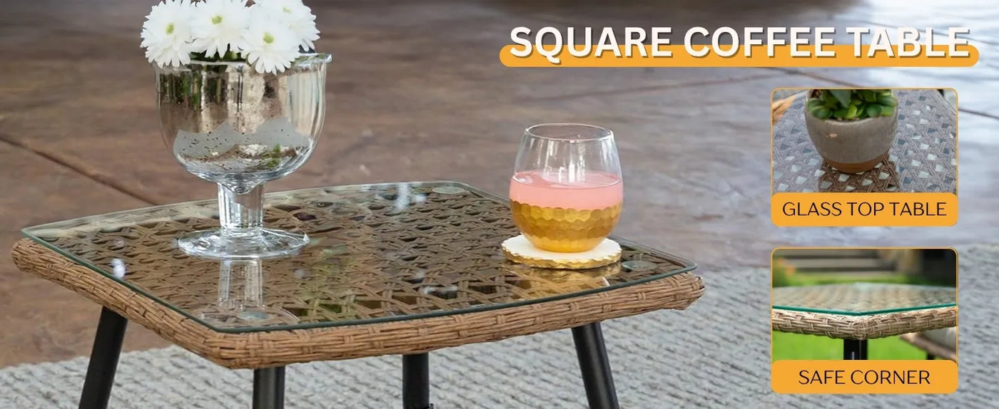 Transform your outdoor space into a cozy and stylish retreat with this 3-Piece Patio Furniture Set in elegant Beige and Cream. Whether you're relaxing on your balcony, enjoying tea in the garden, or hosting guests in the backyard, this beautifully designed rattan set offers the perfect blend of comfort, durability, and charm. Crafted with premium-quality, handwoven all-weather rattan, each chair is supported by a sturdy powder-coated metal frame that resists rust and wear—ensuring year-round use, rain or shine. The soft, plush cushions are wrapped in a durable, water-resistant fabric and feature a neutral beige and cream palette that complements any outdoor décor. The high-density foam provides exceptional support, while the ergonomic backrest and spacious seat ensure hours of comfortable lounging. The compact yet functional center table comes with a glass top, adding a touch of sophistication while providing the perfect space for drinks, snacks, or your favorite book. Ideal for balconies, porches, lawns, or compact patios, this set brings both style and practicality to any setting.
