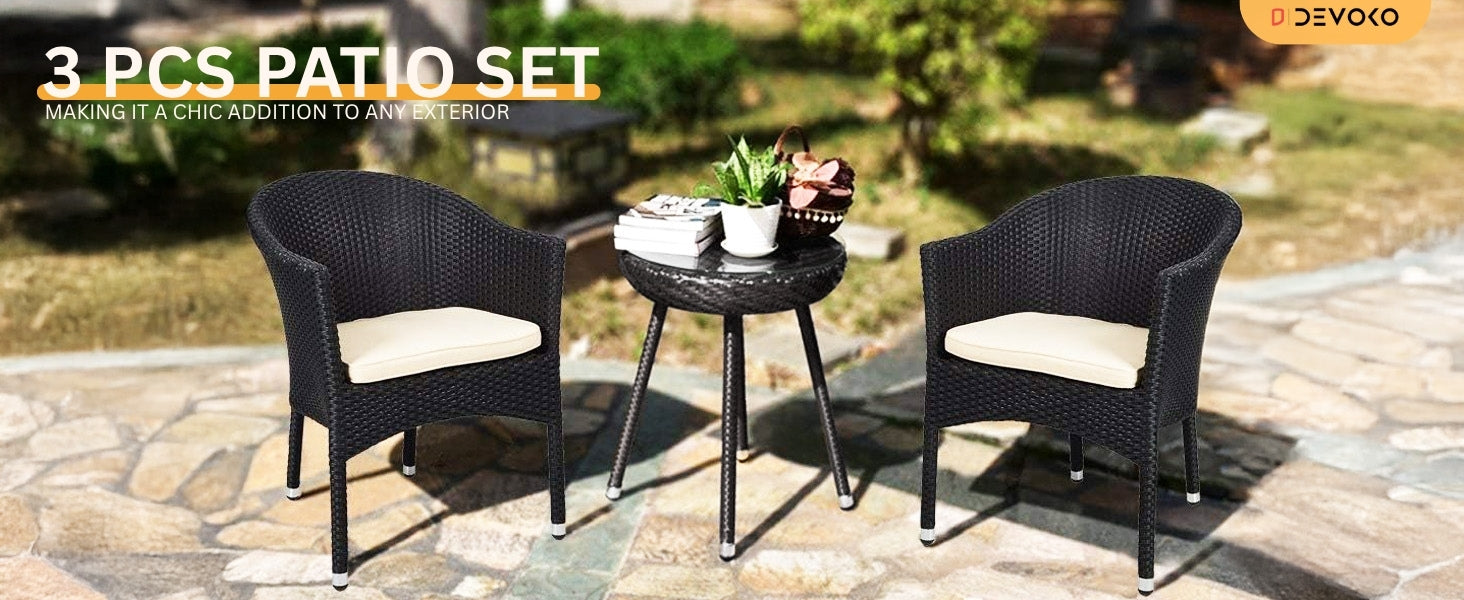 Transform your outdoor space into a cozy retreat with this stylish and practical 3-piece Rattan Wicker Patio Set, designed to bring both comfort and charm to your front porch, balcony, garden, or backyard. Crafted with a modern eye and a nod to timeless elegance, this set includes two ergonomic armchairs and a compact wicker-top coffee table, offering the perfect spot to enjoy your morning coffee, unwind after a long day, or entertain guests in style. Built with a durable powder-coated metal frame and wrapped in handwoven all-weather HDPE rattan, the chairs are lightweight yet strong enough to withstand daily use in any season. The black wicker finish adds a natural, earthy touch, while the cream cushions provide soft, breathable comfort. The cushions feature removable, washable covers, making maintenance a breeze. The table offers a sturdy surface for drinks, books, or décor and is easy to clean. Whether you’re decorating a small balcony or enhancing your outdoor seating area, this compact and stylish set is a space-saving solution that doesn’t compromise on quality or aesthetics.