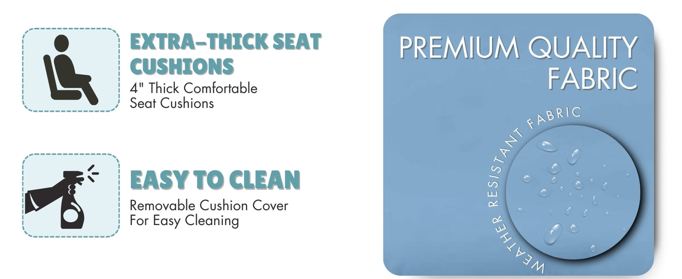 • Comfortable Seating with Cushions : Ergonomically curved chairs with thick, water-resistant seat cushions provide exceptional comfort for extended outdoor lounging.