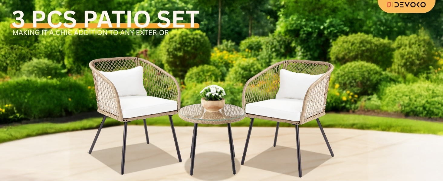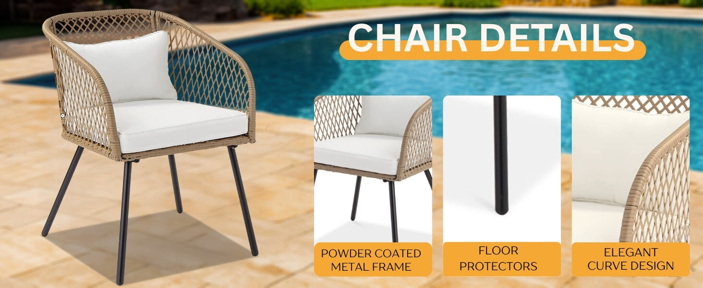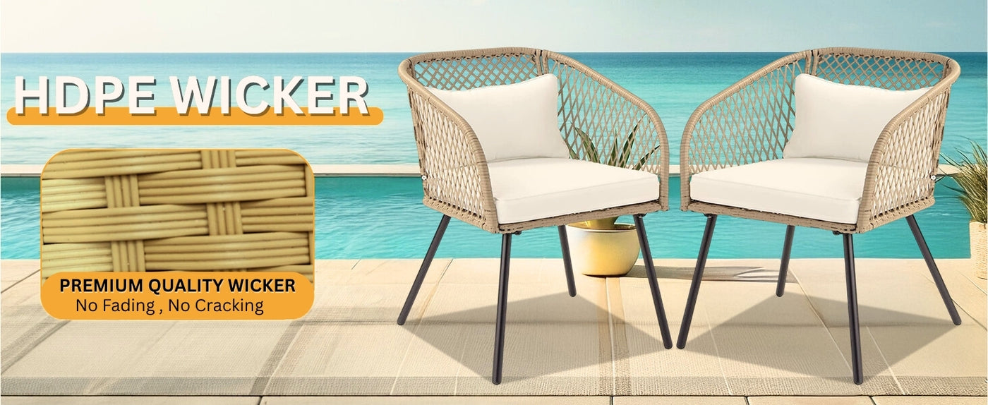 - All-Weather Rattan Wicker : Crafted with premium handwoven synthetic rattan, this patio set resists UV rays, moisture, and fading perfect for enduring the elements on your garden, balcony, poolside, or lawn.