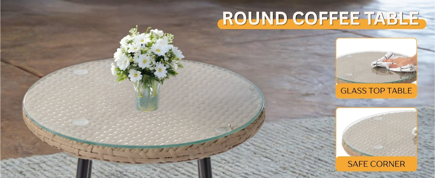 - Glass Top Table with Anti-Slip Design : The sleek and modern coffee table features a strong glass top scratch-resistant, easy to clean, and secured with suction cups for added stability during outdoor use.